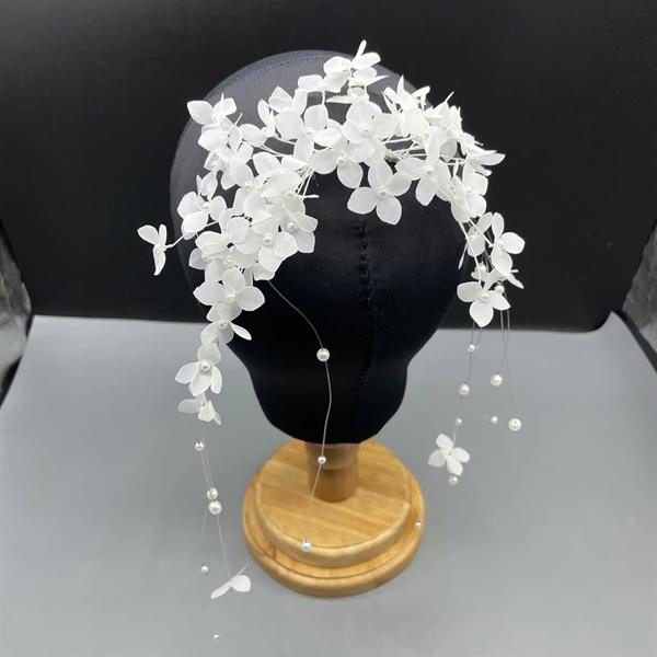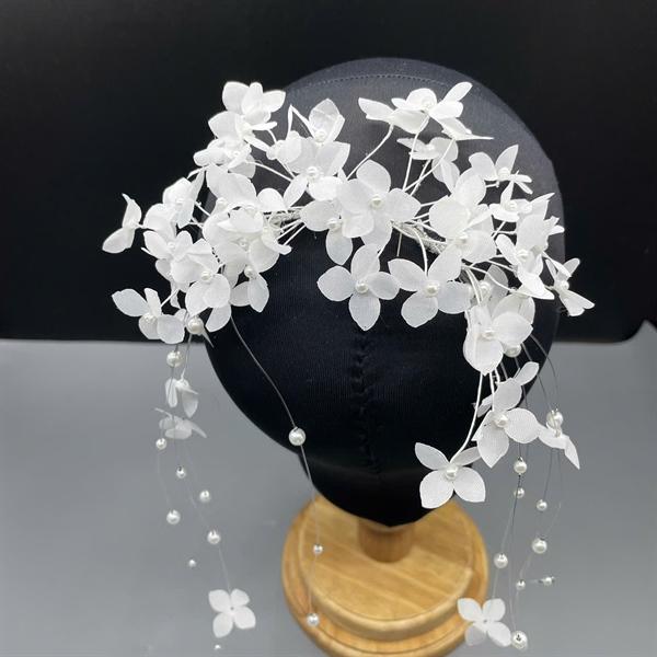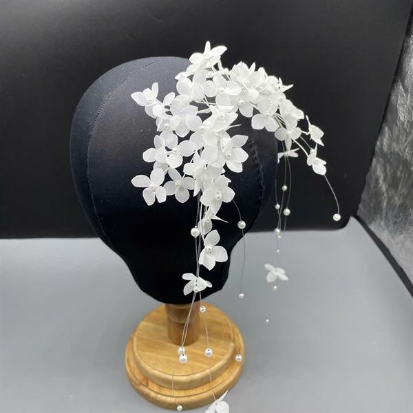 Trâm cài tóc cô dâu thiết kế ngọc trai và hoa 5 canh mềm mại, nữ tính. Tôn lên vẻ đẹp cho mái tóc xinh. Thích hợp trang điểm, make up cô dâu, trang điểm
