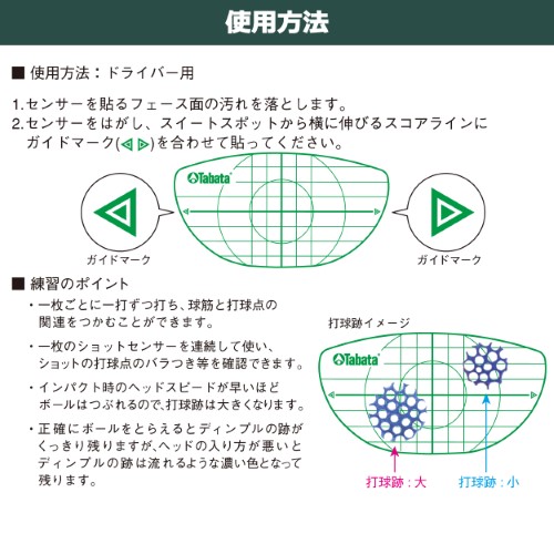 Ghi lại điểm đánh của quả bóng trên giấy nhạy cảm với áp lực loại nhãn dán. Số lượng: 14 tờ. Dành cho gậy Driver. Dán mặt gậy. Số lượng 14 Tờ Ghi lại điểm đánh của quả bóng trên giấy nhạy cảm với áp lực loại nhãn dán. Kích thước gói 130 × 98 (mm)
