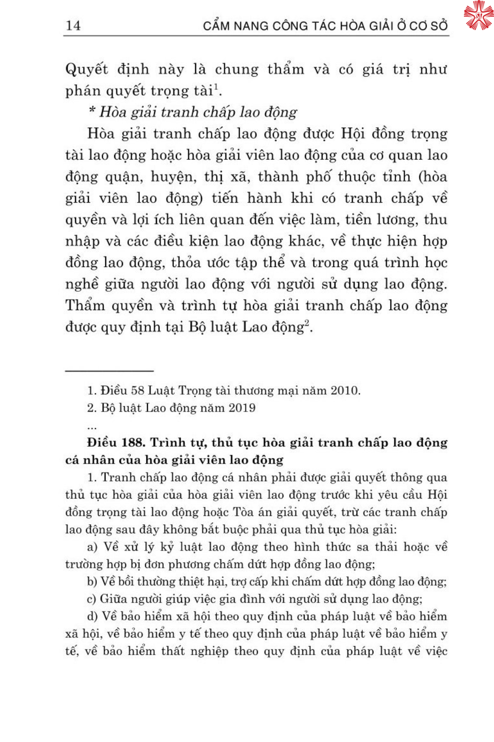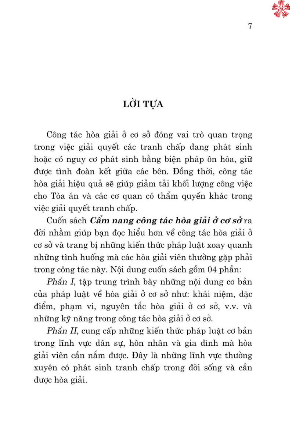 Công tác hòa giải ở cơ sở là một việc làm có ý nghĩa rất thiết thực đối với đời sống xã hội hiện nay nhằm mang lại niềm vui cho mọi người, mọi nhà, giữ gìn trật tự, an toàn xã hội, nâng cao ý thức pháp luật của người dân. Do vậy, việc các chính quyền ở cơ sở cần nắm vững những thông tin liên quan đến công tác hòa giải để giải quyết những mâu thuẫn, tranh chấp nhỏ trong nhân dân là một việc làm cần thiết. Đánh giá tầm quan trọng đó của công tác hòa giải, cuốn sách Cẩm nang công tác hòa giải ở cơ sở được xuất bản sẽ giúp chúng ta nhận thức được vấn đề đã nêu.