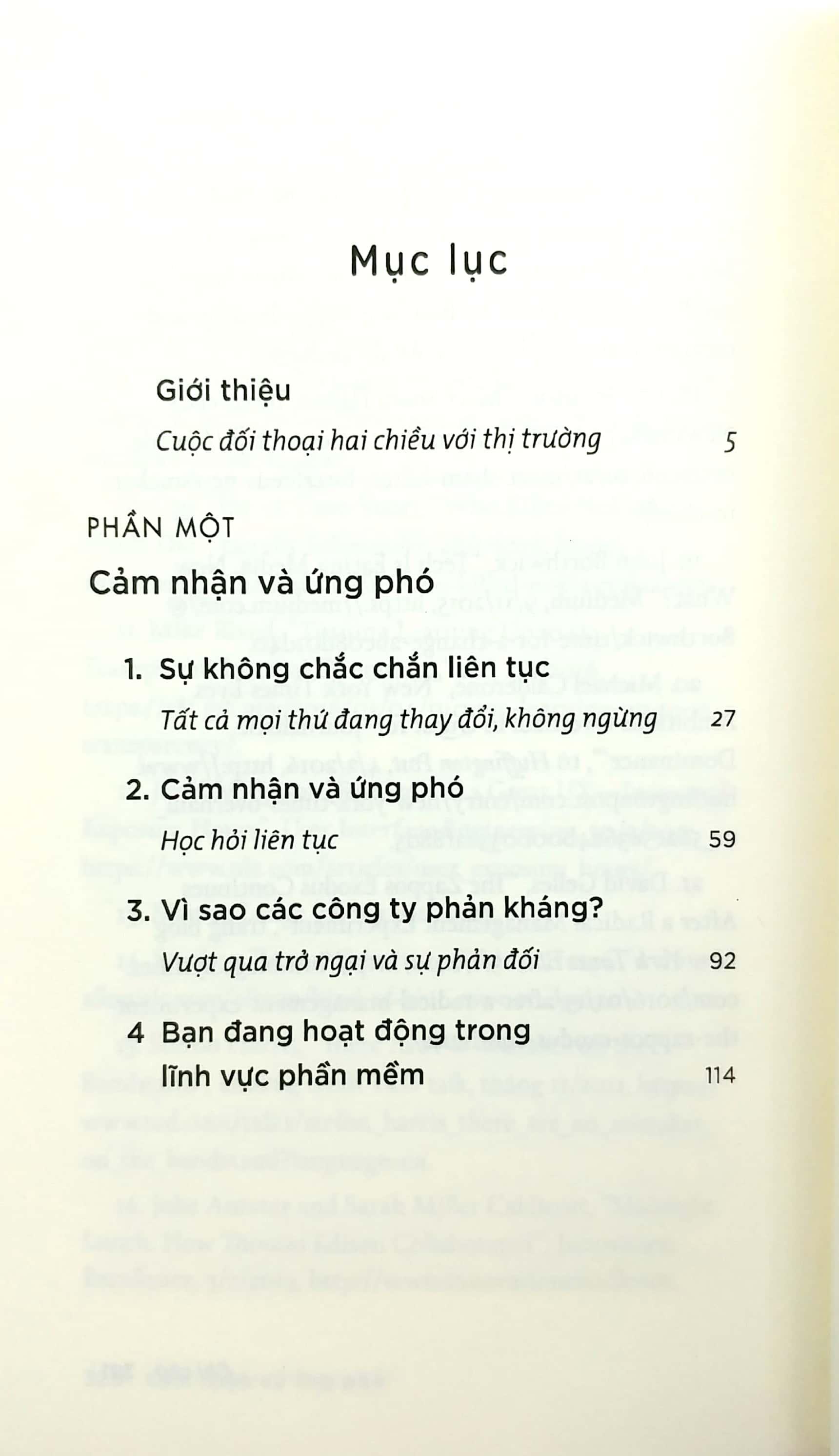 Việc cảm nhận được những thay đổi của thị trường và phản ứng nhanh để có thể đối mặt và vượt qua các khó khăn đóng vai trò sống còn đối với doanh nghiệp. Sách gồm 2 phần: Phần đầu lý giải về mô thức cảm nhận và ứng phó: tại sao nó quan trọng, nó hoạt động ra sao, khi nào thì sử dụng nó (và khi nào thì không), các chướng ngại vật nào bạn có khả năng đối mặt, và cách vượt qua. Phần sau là những hướng dẫn cho các nhà quản trị cách cảm nhận và ứng phó. Nó giải thích các điều chỉnh tổ chức và quy trình hoạch định chính sách để hoạt động theo mô thức này để liên tục đưa ra những giá trị và sản phẩm mới .