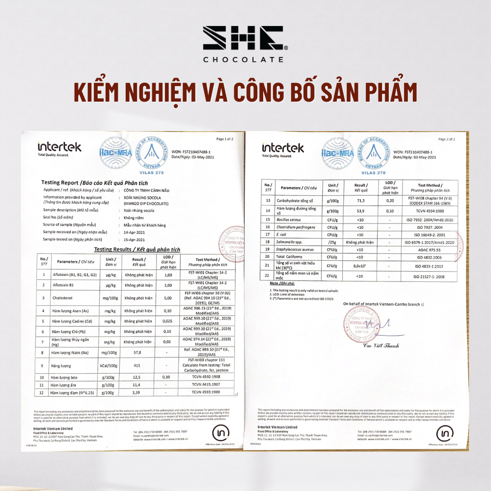 Xoài sấy dẻo nhúng socola SHE Chocolate Socola SHE được làm từ những quả cacao không phân bón và không thuốc bảo vệ thực vật, được chọn lọc rất kỹ từ những nông trại hàng