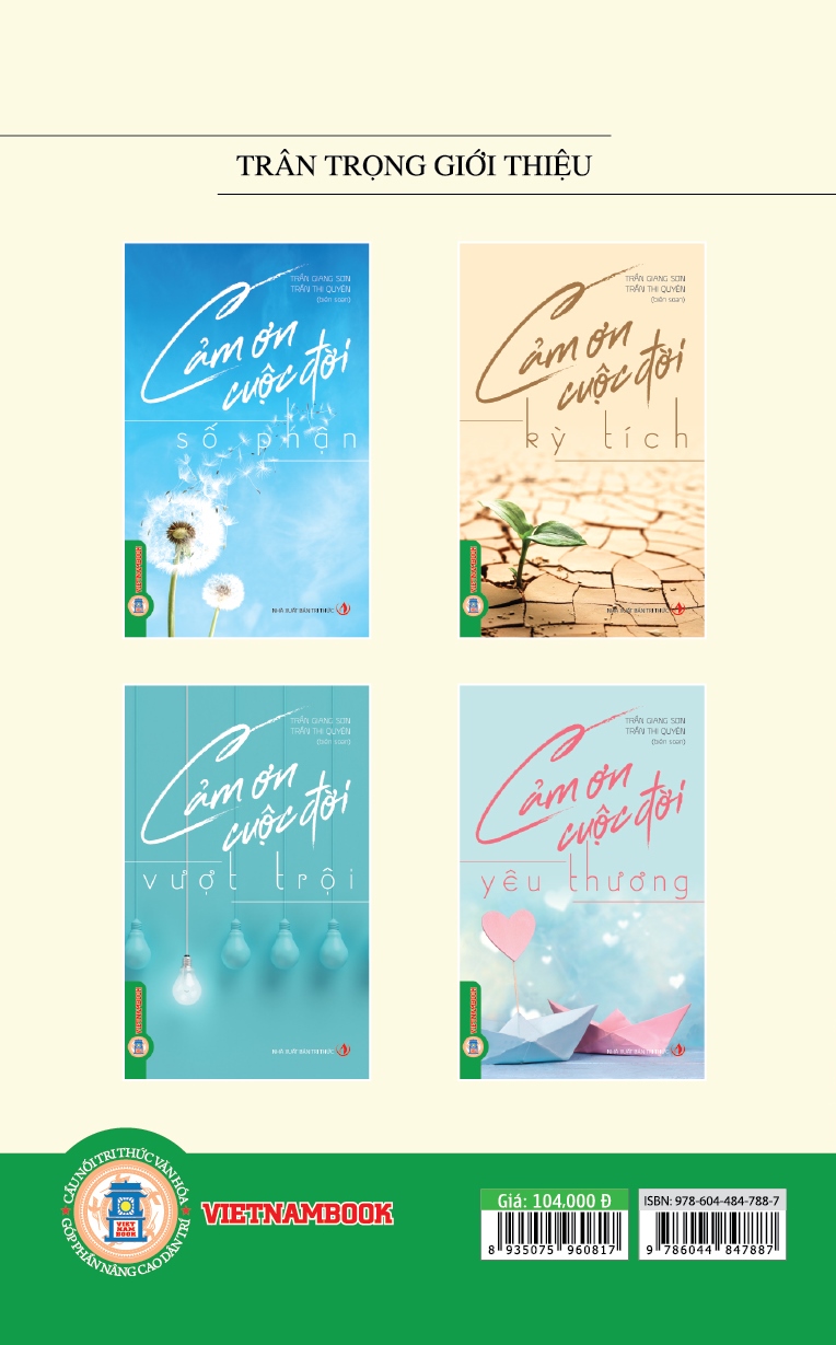 Bộ sách “Cảm ơn cuộc đời” gồm 4 quyển, chia sẻ những khoảnh khắc tuyệt diệu của cuộc sống, giúp mỗi người chúng ta có cơ hội nhìn lại và thấu hiểu giá trị thực sự của những điều xung quanh, từ đó thêm yêu cuộc sống, làm cho cuộc đời trở nên vui vẻ, hạnh phúc và hoàn mỹ hơn. Những kinh nghiệm trong cuộc sống và công việc với khả năng tư duy, đạo đức tốt, sự nỗ lực cố gắng của con người: không ngừng sáng tạo, luôn biết nhìn nhận vấn đề, nắm bắt cơ hội, đặt ra mục tiêu và thực hiện cho bằng được, thể hiện bản thân bằng niềm say mê, cách làm việc có phương pháp và hiệu quả.