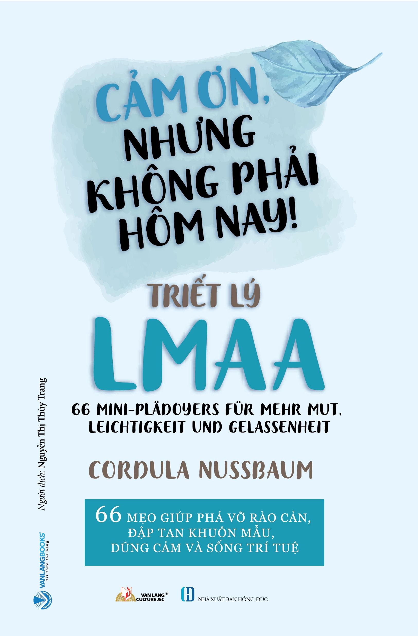 - Cordula Nussbaum - Trong cuộc sống, có rất nhiều cánh cửa mở ra cho chúng ta. Nhưng vì vướng vào vòng xoay đầy phức tạp và luôn luôn thay đổi, mỗi ngày đều đầy rẫy trách nhiệm, nên nhiều người trong chúng ta không cảm thấy thanh thản, bình yên, mà đầy áp lực, gian khổ và trầm uất. Kết quả là, họ ngày càng trở nên héo mòn, và thậm chí hoàn toàn kiệt quệ. Để thoát khỏi vòng quay khổ sở này, ta phải học cách trở nên tốt đẹp hơn bằng cách thực hành Triết lý LMAA – “Cảm ơn, nhưng không phải hôm nay”. Hãy nói “LMAA” đối với những tham vọng thái quá khiến chúng ta mất động lực. Hãy nói “LMAA” đối với những đòi hỏi của người khác khiến ta phải sống một cuộc đời không đích thực. Hãy nói “LMAA” đối với những người đang ra sức dạy bảo ta “phải” sống như thế nào. Hãy nói “LMAA” đối với sự thôi thúc khiến ta luôn phải cố gắng sống tốt hơn và nhanh hơn. Hãy nói “LMAA” đối với cảm giác trách nhiệm và bổn phận đang đè nặng lên ta hằng ngày Với 66 mẹo trong quyển sách truyền cảm hứng này, bạn sẽ lấy lại sự can đảm, điềm tĩnh, và thanh thản sống một cuộc đời đầy ý nghĩa và hạnh phúc.