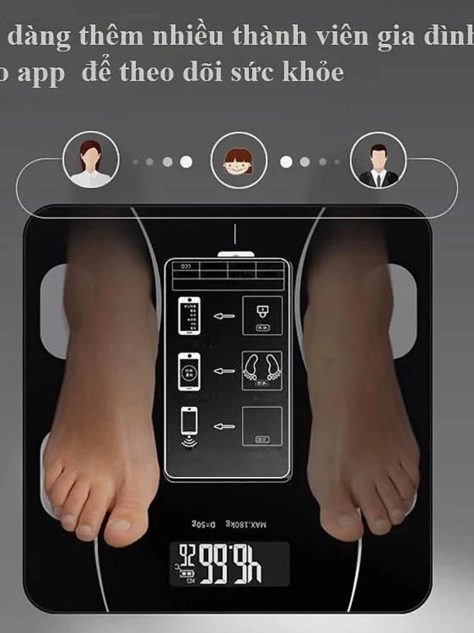 Cân Sức Khỏe Gia Đình là sản phẩm cần thiết mỗi hộ gia đình nên sở hữu ít nhất 1 chiếc để : --> Theo dõi tình hình sức khỏe và cân nặng của con em, cha mẹ, ông bà trong gia đình. Tình hình sức khỏe có liên quan rất lớn đến cân nặng. Ví dụ khi đột ngột bị giảm cân liên tục, giảm nhiều cân trong một thời gian ngắn có thể là dấu hiệu của bệnh tiểu đường,.... --> Sản phẩm nhỏ gọn, có thể nhét vào bất cứ chỗ nào, sẵn sàng sử dụng khi cần. --> Cân để lâu ngày, pin bị hao mòn, pin yếu cũng là nguyên nhân dẫn đến nhiều cân điện tử đo không được chính xác . VÌ VẬY Sắm ngay 1 chiếc Cân có sạc, bảo đảm Pin thường xuyên được nạp đầy, Bạn sẽ có một chiếc cân cho kết quả chính xác hơn.  ======================== ƯU ĐIỂM:  - Kích thước bản : 26 x 26 cm - Hiển thị nhiệt độ phòng rất tiện. - Cân Sạc Điện, TẶNG KÈM CÁP SẠC USB - Màu phun ánh kim loại rất sang trọng và đẹp - Trọng lượng tối đa 180kg, Độ Chia nhỏ nhất 0.05kg - Cảm biến 4 điểm đời mới giúp cân đo chính xác hơn - Có màn hình LCD HD, hiển thị rõ ràng ngay cả trong bóng tối. - Bề Mặt Kính Cường Lực đúc công nghệ mới, không gây sát thương vì khi vỡ dạng tinh thể - LƯU Ý: Cân được VẬT NHẸ TỪ 0.35kg trở lên với ĐIỀU KIỆN làm cân sáng màn hình trước bằng lực bất kỳ, sau đó mới đặt bật nhẹ lên.CÂN ĐANG TỐI MÀN HÌNH, ĐẶT VẬT NHẸ SẼ KHÔNG CÓ PHẢN ỨNG. ======================= CÁC CHỈ SỐ PHÂN TÍCH :  - Cân nặng lý tưởng  - Đo trọng lượng cơ thể - Tỉ lệ cơ thể BMI  - Đo tỉ lệ mỡ nội tạng - Đo tỷ lệ nước trong cơ thể  - Đo tỷ lệ cơ bắp  - Đo khối lượng xương - Tỉ lệ trao đổi chất, protein, béo phì,.... LƯU Ý: TUY NHIÊN với 1 số độ tuổi nhất định các chỉ số này sẽ không hỗ trợ hiển thị, ví dụ bé 2 tuổi mặc định chỉ hiển thị cân nặng và chỉ số BMI. *HƯỚNG DẪN SỬ DỤNG:   Bước 1: Tải ứng dụng OKOK INTERNATIONAL App trên CH Play hoặc App Store   Bước 2: Nhập Mail và Password tùy ý và làm theo hướng dẫn trên app ( rất dễ bao gồm: Nick Name, Ngày sinh, Giới tính, Chiều cao)  Bước 3: Bật bluetooth của điện thoại bạn và đứng lên cân để trải nghiệm nhé  LƯU Ý KHI CÂN  - Đặt cân ở bề mặt thăng bằng, đảm bảo Cân không bị kênh để có kết quả đo chính xác nhất - Không lấy kết quả của 5 lần cân đầu tiên sau khi mới mua về - Mỗi lần cân cách nhau khoảng 10s, không nên lên xuống liên tục - Mỗi khi lấy ra sử dụng, bỏ qua kết quả cân lần đầu tiên, bắt đầu tính kết quả từ lần cân thứ 2 - Khi Pin yếu kết quả đo sẽ bớt chuẩn xác - Khi Kiểm tra độ chuẩn của cân không nên xê dịch vị trí,nên đặt yên 1 vị trí