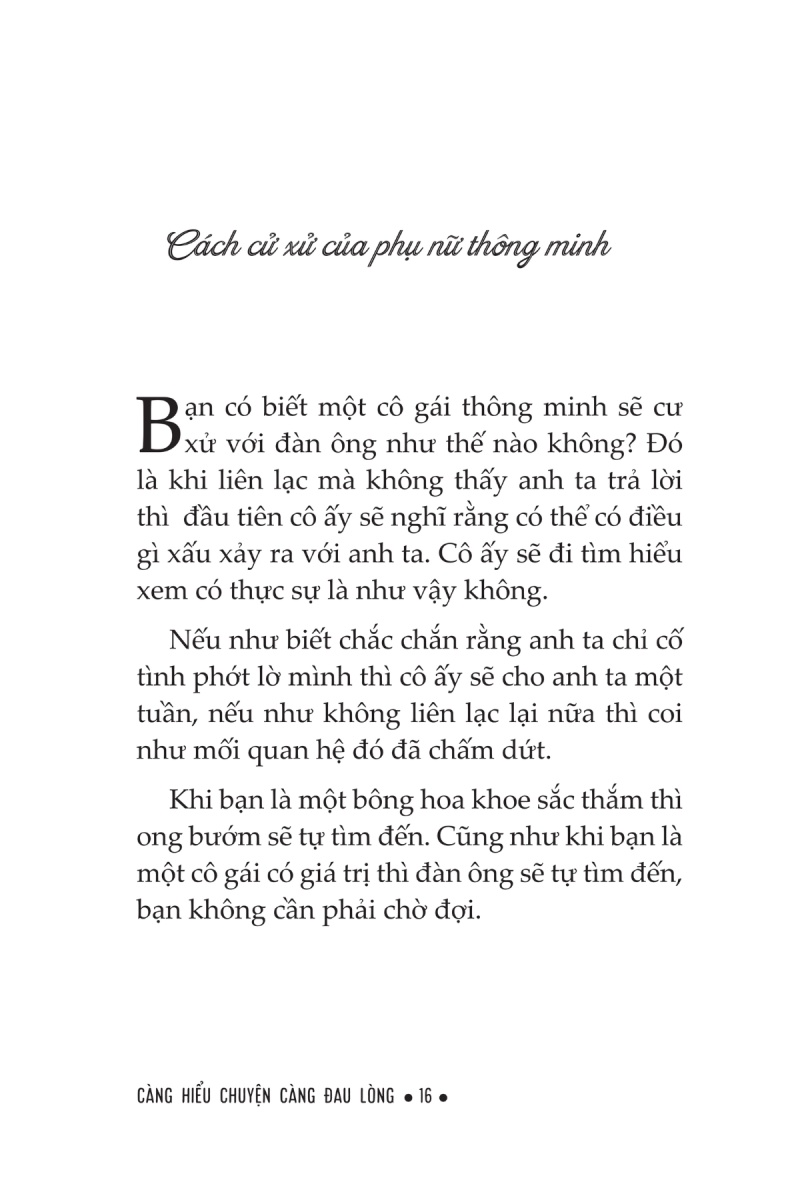 “Càng hiểu chuyện, càng đau lòng” là lời động viên, cổ vũ bạn theo đuổi phiên bản HẠNH PHÚC nhất, ĐẮT GIÁ nhất, KHÍ CHẤT nhất của chính mình. Cuốn sách cần bạn chậm rãi đọc để: - Học cách nói “không”, từ chối những việc mình không thích, hãy thật thà với cảm xúc của bản thân. - Học cách kiên tâm, vững trí, đối đãi tử tế với người tử tế, cũng lạnh lùng, dứt khoát với người không coi trọng bạn. - Học cách không phản bội chính mình! Quyết định rồi thì nên dứt khoát, từ bỏ rồi thì đừng quay đầu, chia tay rồi thì hãy bình thản bước đi,… Khi bạn vừa đẹp, vừa khí chất, vừa tự tay kiếm được tiền, bạn sẽ hiểu: bạn làm gì có thời gian tính toán được mất, làm gì có thời gian đoán này đoán nọ, làm gì phải quá hiểu chuyện, sống quỵ luỵ ai?