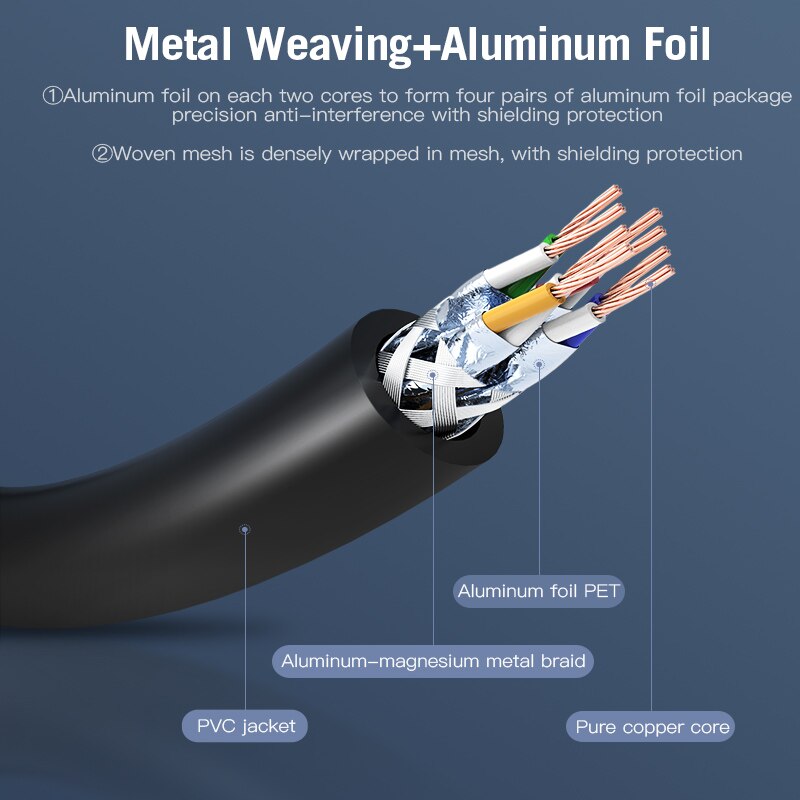1. Data transfer rate: 10G 2. Frequency: 600MHz 3. 4 shielded twisted pair (U/FTP) of copper wires 4. Pure Copper Core