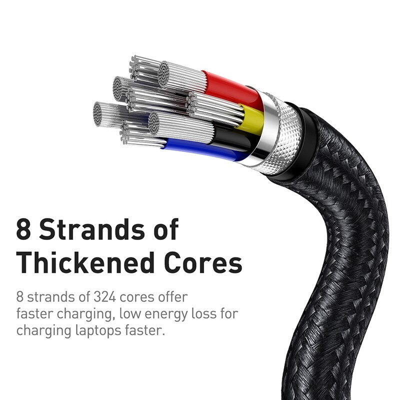 Phần thân được bọc vải dù giảm tỉ lệ đứt gãy cũng như tăng độ bền cho dây, bên trong được trang bị lên đến 8 lõi đồng giúp ổn định công suất 100W khi sạc cũng như khi truyền dữ liệu.