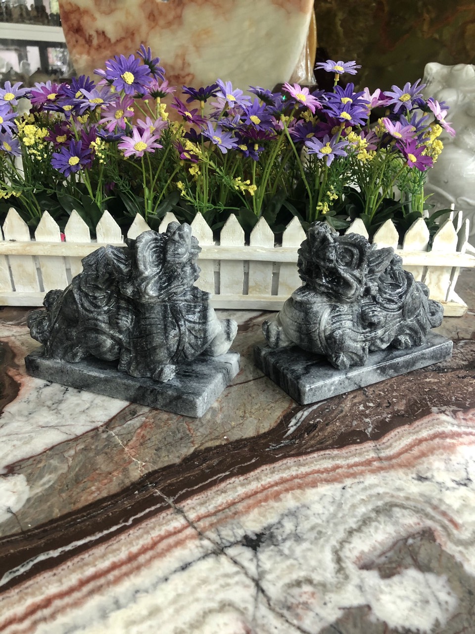 Hợp mệnh Thủy - Mộc Chất liệu: Đá cẩm thạch vân đen Kích thước: Dài 15 cm X Rộng 6 cm x Cao 12,5 cm Khối lượng: 3,2 kg / cặp Ý nghĩa Tỳ Hưu: là linh vật dùng để chiêu tài, giúp chủ nhân gặp may mắn về công danh sự nghiệp, đồng thời có tác dụng trấn trạch, trừ tà khí, đem lại bình yên cho ngôi nhà. Tỳ hưu có tác dụng hóa giải hướng nhà, công ty, văn phòng, cửa hàng… Vị trí đặt: Để bàn làm việc, phòng khách, trưng bày, bàn học, bàn thờ thần tài, cửa hàng kinh doanh, két sắt, quà tặng ý nghĩa,