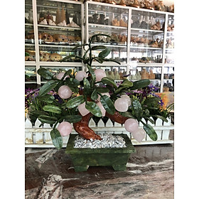 Chất liệu: Quả đào bằng đá thạch anh hồng, lá và chậu cây là đá ngọc Ấn Độ Bao gồm: 28 quả Kích thước: Cao 50 cm x Ngang 34 cm Khối lượng: 6 kg