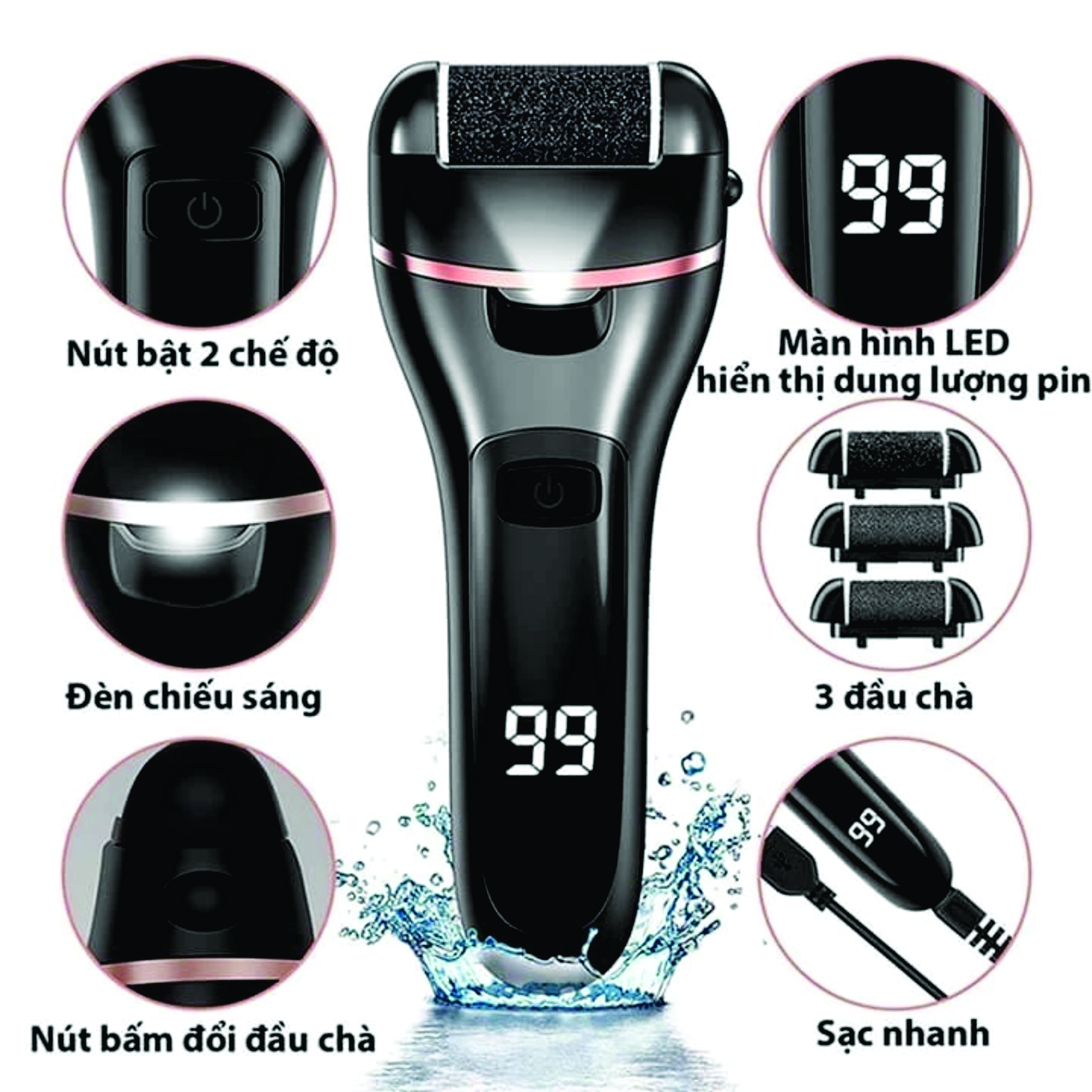 THÔNG TIN SẢN PHẨM Chất liệu sản phẩm: ABS + đầu đá mài Chế độ mài chân: 2 loại (nhanh, chậm) - Điện áp: 3.7V - Công suất: 2W - Dung lượng pin: 500mAh - Màu sắc: Hồng - Trọng lượng kim loại trần: 106g Kích thước kim loại trần: 19,2 * 3,6cm Trọng lượng của một