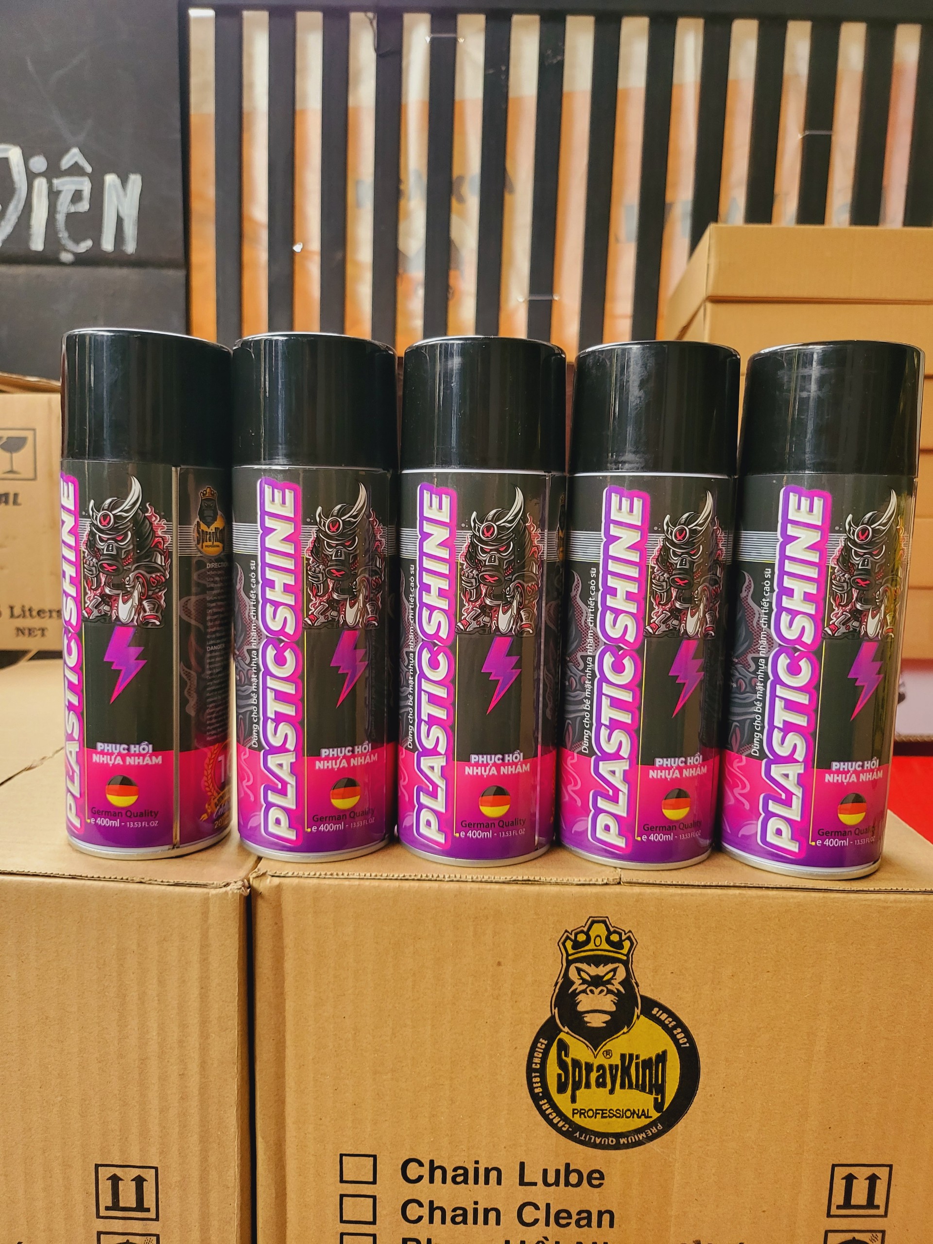 Chai xịt phục hồi nhựa nhám, nhựa đen, dưỡng đen dàn nhám Sprayking Plastic Shine 400ml, dàn áo phai màu Sử dụng được cho xe máy và ô tô THÀNH PHẦN: Dầu gốc tổng hợp,chất