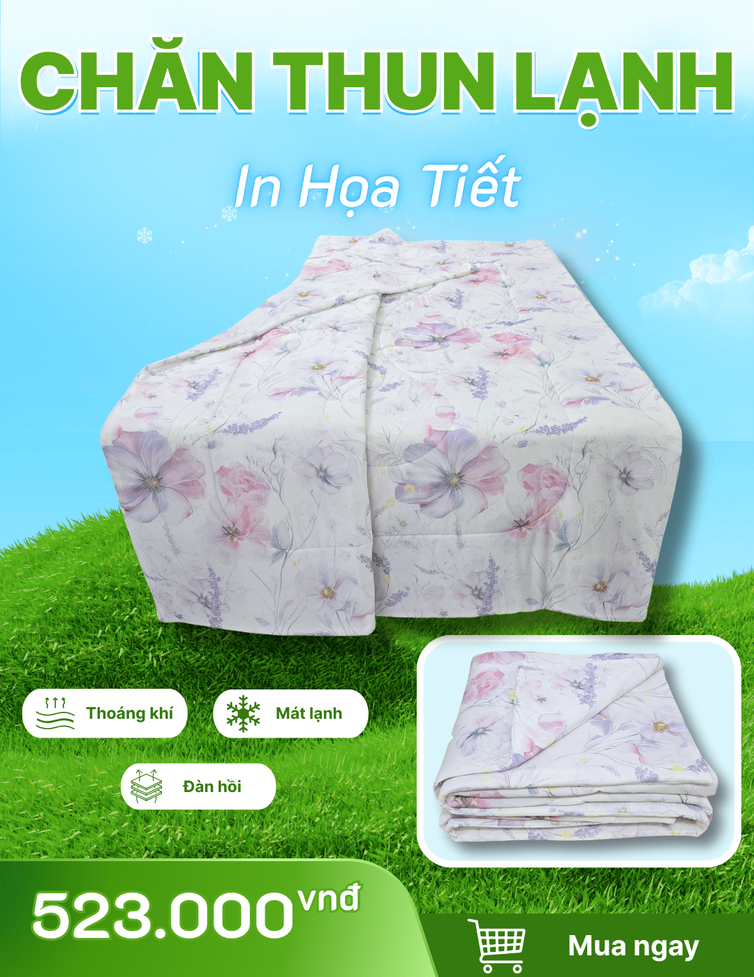 Thông Tin Sản Phẩm: Tên sản phẩm: Chăn chần Thun Lạnh in Họa Tiết Chất liệu vải: 95% Polyester & 5% Spandex Bao bì: Túi PVC quai xách Kích thước sản phẩm: 180cm x 200cm