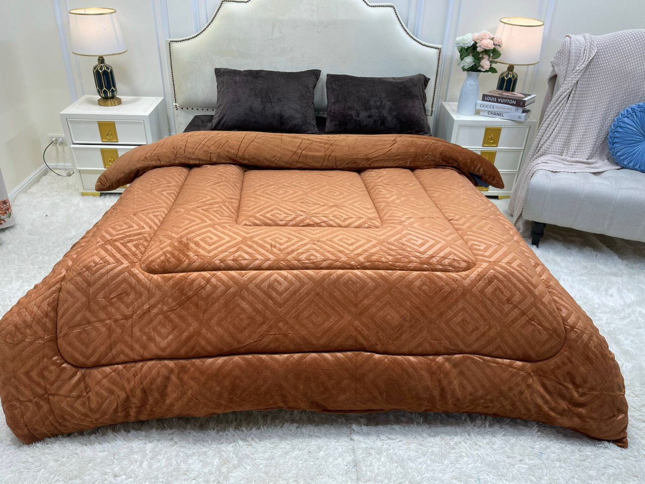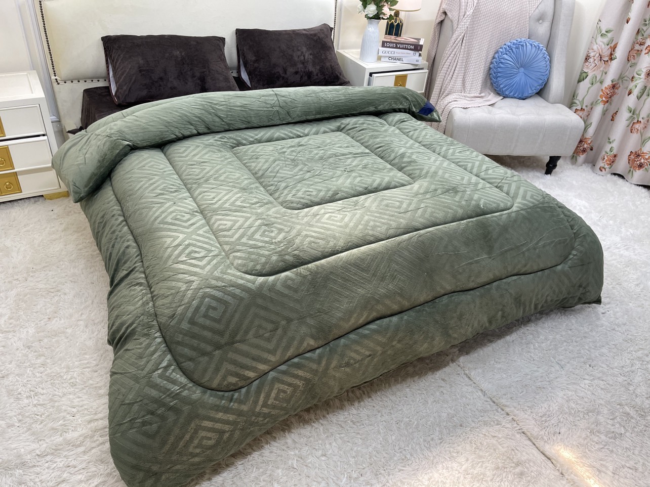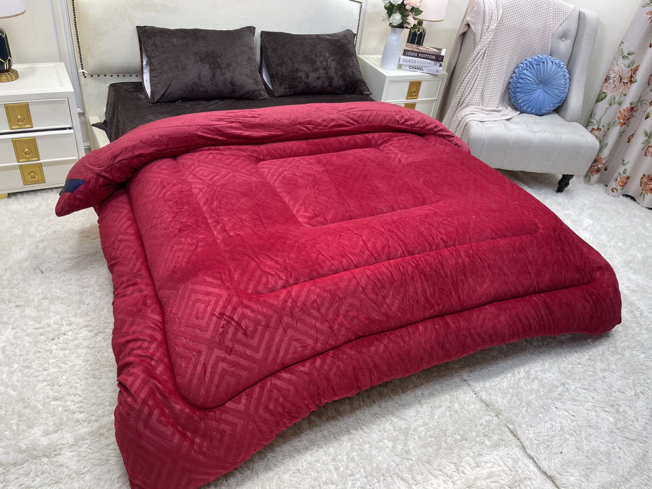 Size Queen 248x233cm chuẩn Âu – rộng rãi, ôm trọn giấc ngủ. • Trọng lượng ~2.2kg – siêu nhẹ, siêu êm, cực ấm. • Bề mặt nhung mịn, dày, không bám lông – chạm vào