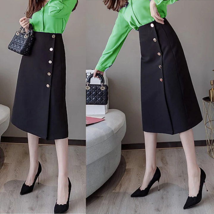 Chân Váy Công Sở Dáng Váy Chữ A Dài Qua Gối Hàng Thiết Kế Kiểu Tà Đấp Che Bụng Phối Cúc cá Tính