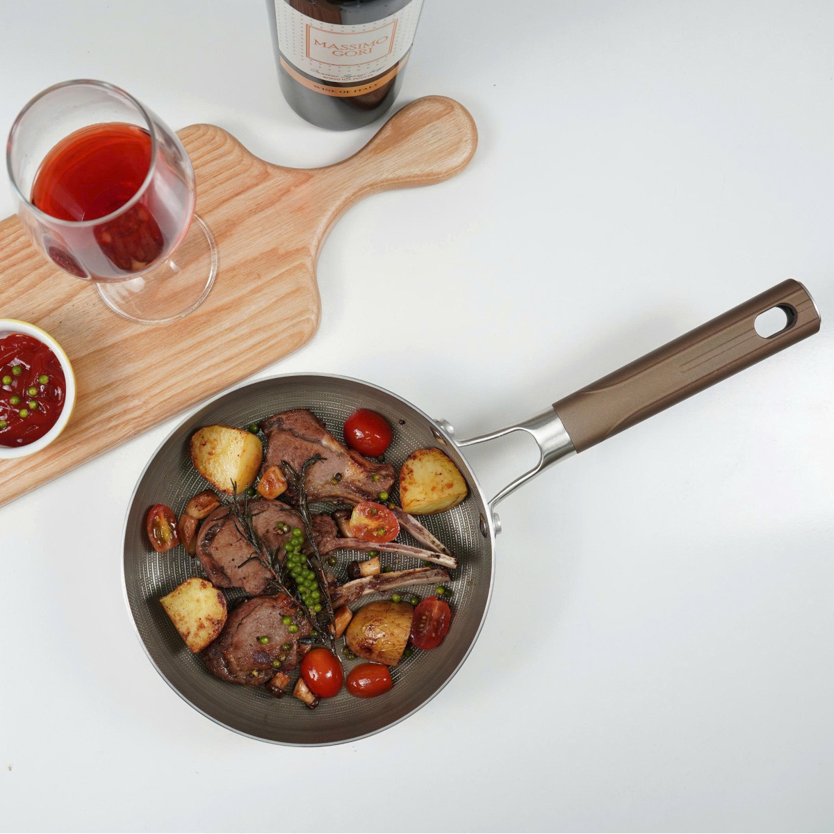 Lớp ngoài cùng - Inox 430 dẫn từ: Không chỉ tăng độ bền cho chảo, lớp inox 430 còn giúp chảo tương thích với mọi loại bếp – từ bếp gas, bếp điện đến bếp từ, giúp bạn linh hoạt sử dụng trong mọi điều kiện.