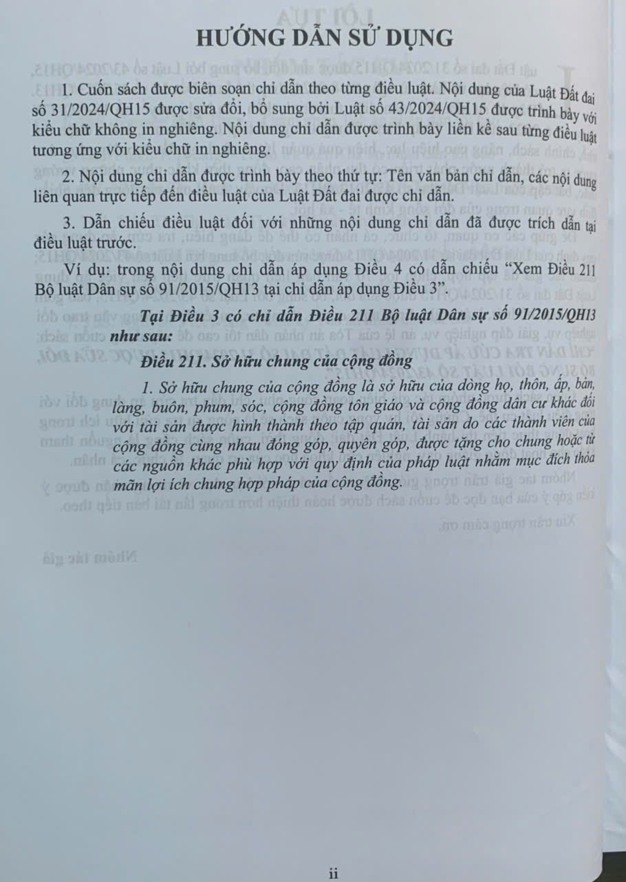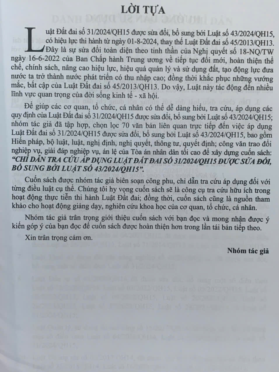 Để giúp các cơ quan, tổ chức, cá nhân có thể dễ dàng hiểu, tra cứu, áp dụng các quy định của Luật Đất đai số 31/2024/QH15 được sửa đổi, bổ sung bởi Luật số 43/2024/QH15; nhóm tác giả đã tập hợp, chọn lọc 70 văn bản liên quan trực tiếp đến việc áp dụng Luật Đất đai số 31/2024/QH15 được sửa đổi, bổ sung bởi Luật số 43/2024/QH15, bao gồm Hiến pháp, bộ luật, luật, nghị định, nghị quyết, thông tư, quyết định; công văn trao đổi nghiệp vụ, giải đáp nghiệp vụ, án lệ của Tòa án nhân dân tối cao để xây dựng cuốn sách: “CHỈ DẪN TRA CỨU ÁP DỤNG LUẬT ĐẤT ĐAI SỐ 31/2024/QH15 ĐƯỢC SỬA ĐỔI, BỔ SUNG BỞI LUẬT SỐ 43/2024/QH15”.