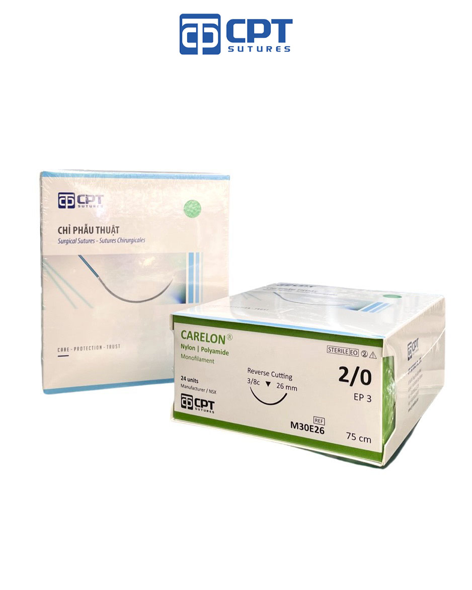 Chỉ phẫu thuật không tiêu Carelon Nylon: 2/0 USP, dài 75 cm, kim tam giác 3/8c, dài 26 mm, mã hàng: M30E26. Quy cách đóng gói: 24 tép. THÀNH PHẦN: Carelon là chỉ phẫu