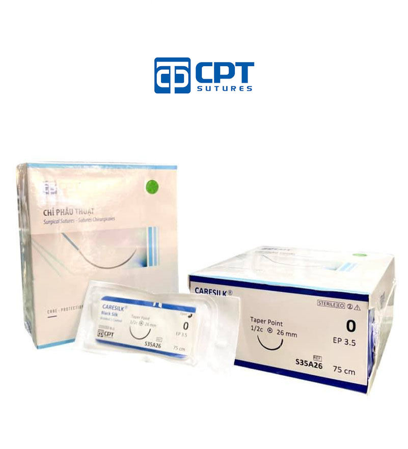 Chỉ phẫu thuật không tiêu Caresilk Silk: size cỡ chỉ: số 0 USP, dài 75 cm, kim tròn 1/2c, dài 26 mm, mã hàng: S35A26. Quy cách đóng gói: 24 tép. THÀNH PHẦN: