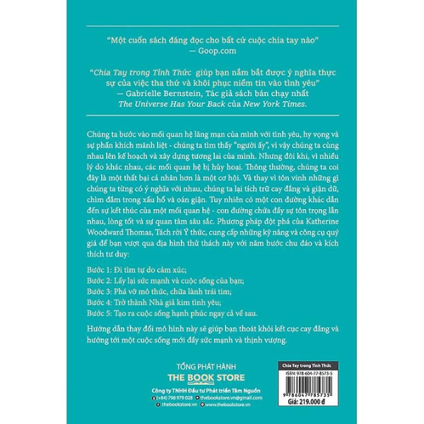 "Một cuốn sách đáng đọc cho bất cứ cuộc chia tay nào” “Chia Tay trong Tỉnh Thức  giúp bạn nắm bắt được ý nghĩa thực sự của việc tha thứ và khôi phục niềm tin vào tình yêu” - Gabrielle Bernstein, tác giả sách bán chạy nhất “The Universe Has Your Back” của New York Times Chúng ta bước vào mối quan hệ lãng mạn của mình với tình yêu, hy vọng và sự phấn khích mãnh liệt - chúng ta tìm thấy “người ấy”, vì vậy chúng ta cùng nhau lên kế hoạch và xây dựng tương lai của mình. Nhưng đôi khi, vì nhiều lý do khác nhau, các mối quan hệ bị hủy hoại. Thông thường, chúng ta coi đây là một thất bại cá nhân hơn là một cơ hội. Và thay vì tôn vinh những gì chúng ta từng có ý nghĩa với nhau, chúng ta lại tích trữ cay đắng và giận dữ, chìm đắm trong xấu hổ và oán giận. Tuy nhiên có một con đường khác dẫn đến sự kết thúc của một mối quan hệ - con đường chứa đầy sự tôn trọng lẫn nhau, lòng tốt và sự quan tâm sâu sắc. Phương pháp đột phá của Katherine Woodward Thomas, Tách rời Ý thức, cung cấp những kỹ năng và công cụ quý giá để bạn vượt qua địa hình thử thách này với năm bước chu đáo và kích thích tư duy: Bước 1: Đi tìm tự do cảm xúc; Bước 2: Lấy lại sức mạnh và cuộc sống của bạn; Bước 3: Phá vỡ mô thức, chữa lành trái tim; Bước 4: Trở thành Nhà giả kim tình yêu; Bước 5: Tạo ra cuộc sống hạnh phúc ngay cả về sau. Hướng dẫn thay đổi mô hình này sẽ giúp bạn thoát khỏi kết cục cay đắng và hướng tới một cuộc sống mới đầy sức mạnh và thịnh vượng. “Có rất nhiều trí tuệ, trái tim và sự hài hước trong cuốn sách này, bạn sẽ muốn đặt nó dưới gối khi ngủ. Katherine truyền đạt những điều đích thực - bạn sẽ thấy điều đó ngay lập tức và an lòng vì có một người bạn như vậy trên chặng đường này. Với khối óc, trái tim, thân thể và trí tuệ về các mối quan hệ được thu thập sau nhiều năm khám phá sâu sắc, Chia Tay trong Tỉnh Thức là cuốn sách mà bạn đang tìm kiếm để hướng dẫn bạn đến với sự tự do đích thực. Tôi yêu nó!” — Kathlyn Hendricks, Ph.D., đồng tác giả sách bán chạy nhất Conscious Loving and Conscious Loving Ever After của New York Times Thông tin tác giả KATHERINE WOODWARD THOMAS, MA, MFT, Tác giả của cuốn sách bán chạy nhất “Thu hút Người bạn đời Lý ưởng: 7 tuần Sáng tạo Tình yêu Đời bạn”; Nhà trị liệu hôn nhân và gia đình; đồng sáng tạo các khóa học trực tuyến cũng như các khóa đào tạo nhà khai vấn được chứng nhận của chương trình Thu Hút Bạn Đời Lý Tưởng và Quyền Năng Tính Nữ; Nhà sáng tạo ra quy trình “5 bước Chia Tay trong Tỉnh Thức” cùng khóa học trực tuyến và đào tạo các nhà khai vấn được chứng nhận thuộc chương trình cùng tên.
