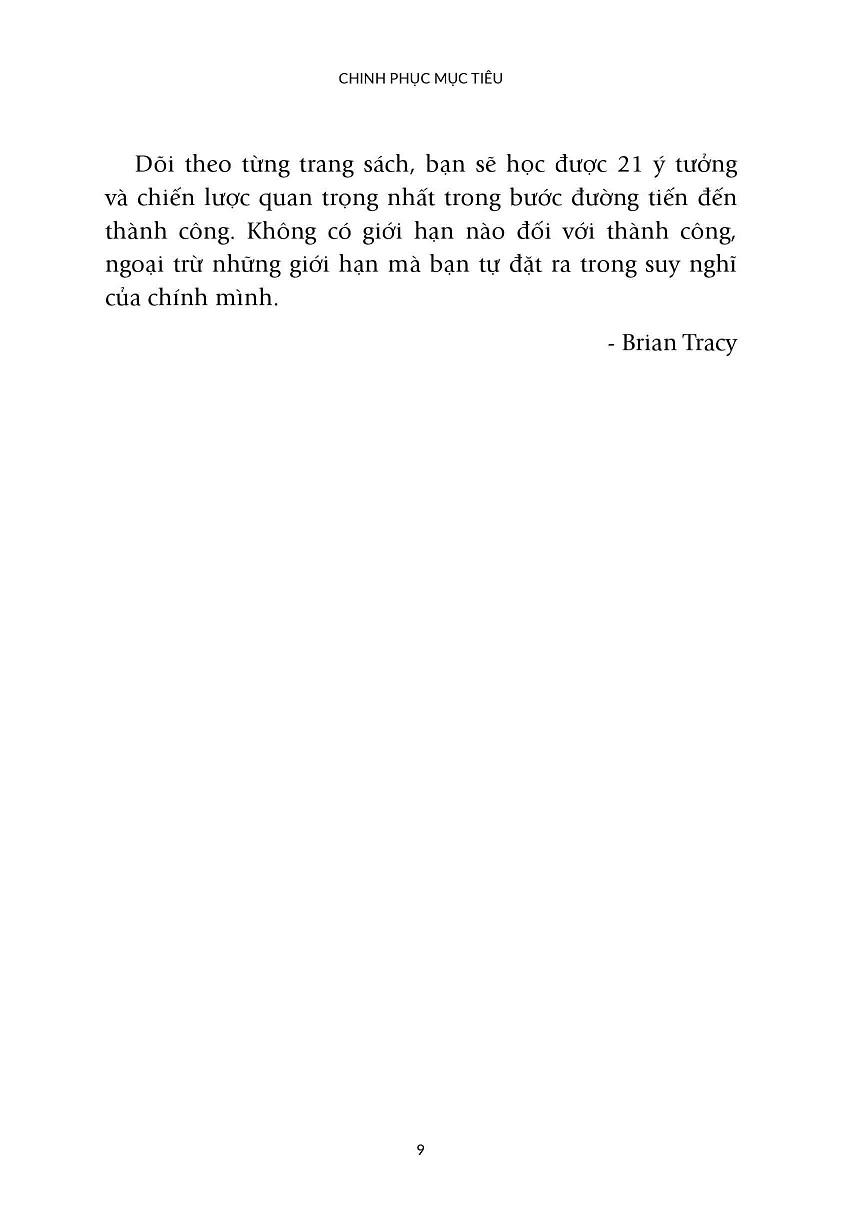 Trong "Chinh phục mục tiêu", Brian Tracy tập hợp tất cả mọi kinh nghiệm, ý tưởng và chiến lược hiện thực hoá mục tiêu thành một hệ thống bài bản. Tác giả trình bày 21 ý tưởng đột phá, mà chỉ cần biết đến chúng thôi sẽ giúp con đường đến thành công của bạn ít trắc trở hơn rất nhiều. Chẳng hạn như: Lên kế hoạch, đo lường tiến bộ của bản thân, kết giao với những người phù hợp hay luôn luôn linh hoạt.