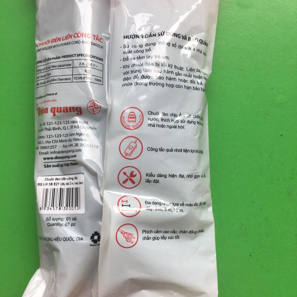 Mua tại TiktokChuôi đèn liền công tắc Điện Quang ĐQ LH E27 chống ẩm - kèm phích cắm và dây dài 3m/5m/10m 1/ ĐẶC ĐIỂM SẢN PHẨM Công tắc quả nhót tiện lợi khi bật/tắt. Kiểu dáng hiện đại và nhỏ gọn, dễ lắp đặt và tháo ráp. Nhiều kích thước độ dài dây: 3m/5m/10m. Chuôi đèn chịu ẩm và chống đọng nước, rất thích hợp khi sử dụng treo trong nhà lẫn ngoài sân vườn, ngoài trời. Thiết kế: thân chuôi đèn thiết kế rãnh, chống đọng nước bên trong chuôi đèn. Phích cắm: chân đồng làm chắc chắn, giúp tiếp xúc tốt. Chuôi đèn sử dụng nhựa chống cháy 2/ THÔNG SỐ KỸ THUẬT *Thông số điện Công suất: 400 W tại 220 V ~, 500 W tại 250 V ~