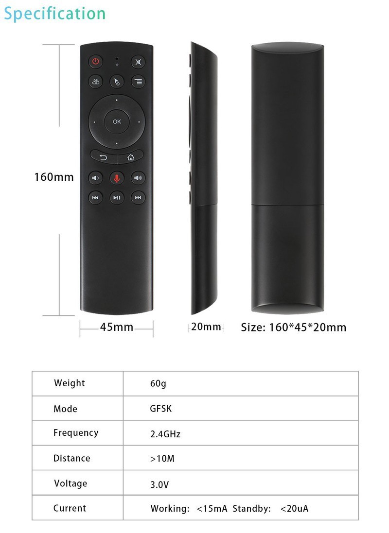 Điều khiển chuột bay tìm kiếm giọng nói Remote Mouse Air g20s - điều khiển cử chỉ thông minh Chuột bay g20s có tem gyroscope chuột bay tìm kiếm giọng nói Remote Mouse G20s - có chức năng điều khiển cử chỉ Tìm kiếm giọng nói 1 chạm (cơ chế bấm nhả ra lệnh) Lưu ý: Điều khiển giọng nói theo cơ chế Voice Assistant Có thể học lệnh 1 nút nguồn Tương thích với nhiều thiết bị sử dụng HĐH Android, máy tính Dùng tốt trên các 6.0 trở lên, đặc biệt là với HĐH AndroidTV Model: g20s chuột bay Chức năng hoạt động: Điều khiển điều hướng, cử chỉ chuột bay Tìm kiếm giọng nói 1 chạm (cơ chế bấm nhả ra lệnh) Lưu ý: Điều khiển giọng nói theo cơ chế Voice Assistant Có thể học lệnh 1 nút nguồn Tương thích với nhiều thiết bị sử dụng HĐH Android, máy tính Lưu ý: