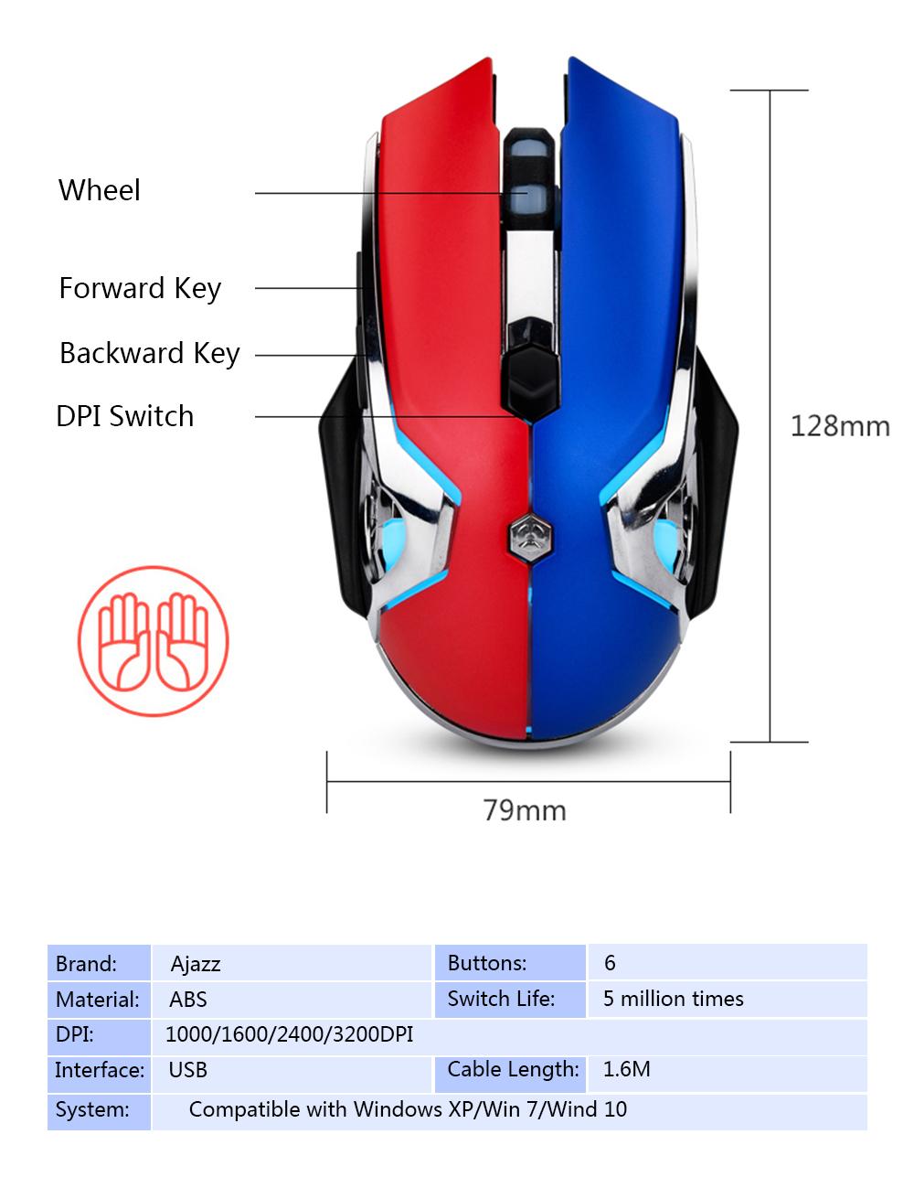 This is a practical mouse. Ergonomic design, very comfortable for you to use for a long time. With features like 6 buttons, 4 levels of adjustable DPI, this mouse will bring the most comfortable experience that you never have before. This mouse looks cool and full of personality. It is a perfect partner in office or at home. Features: Macro Programming, 6-Key Customization Customized key functions and detailed parameter settings, powerful macro functions to let the combination skill keys release, easy to operate games. 4 Adjustable DPI Featuring 4 adjustable DPI, you can switch different DPI for different working scenes, providing precise positioning. Enhanced Game Fretting Depending on the pressure used, it would use green point and black point fretting. Ergonomic Design This mouse fits for you comfortably under your palm and you will not feel tired during long time using. Wide Compatibility It is suitable for Windows XP/Win 7/Wind 10 system and many games. Plug and Play Fashion and small, compact and lightweight, plug and play, convenient to use. Many Ocassions Built-in high quality chip, fast and stable. Perfect for home and office. Specifications: Brand: Ajazz Material: ABS Color: Black / Black Blue / Red Blue / Red Black (Optional) DPI: 1000/1600/2400/3200DPI Interface: USB Buttons: 6 Switch Life: 5 million times System: Compatible with Windows XP/Win 7/Wind 10 Cable Length: 1.6M Item Size:12.8 7.9 4.1cm / 5.04 3.11 1.61in Item Weight: 134g Package Size: 14 10 5cm / 5.51 3.94 1.97in Package Weight: 170g Packing List: 1 * Mouse