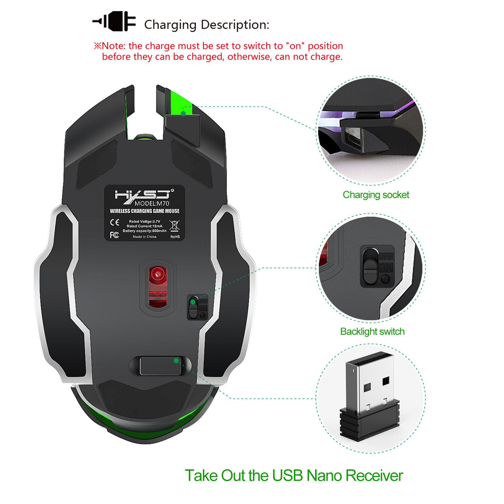 Description: Smooth, precise andwireless optical 7-button mouse with receiver and colorful backlight effect for game enthusiasts. Features: Features: Optical laser technology for precise control, built-in rechargeable lithium battery,TYPE-C interface quickly charge, There is no need