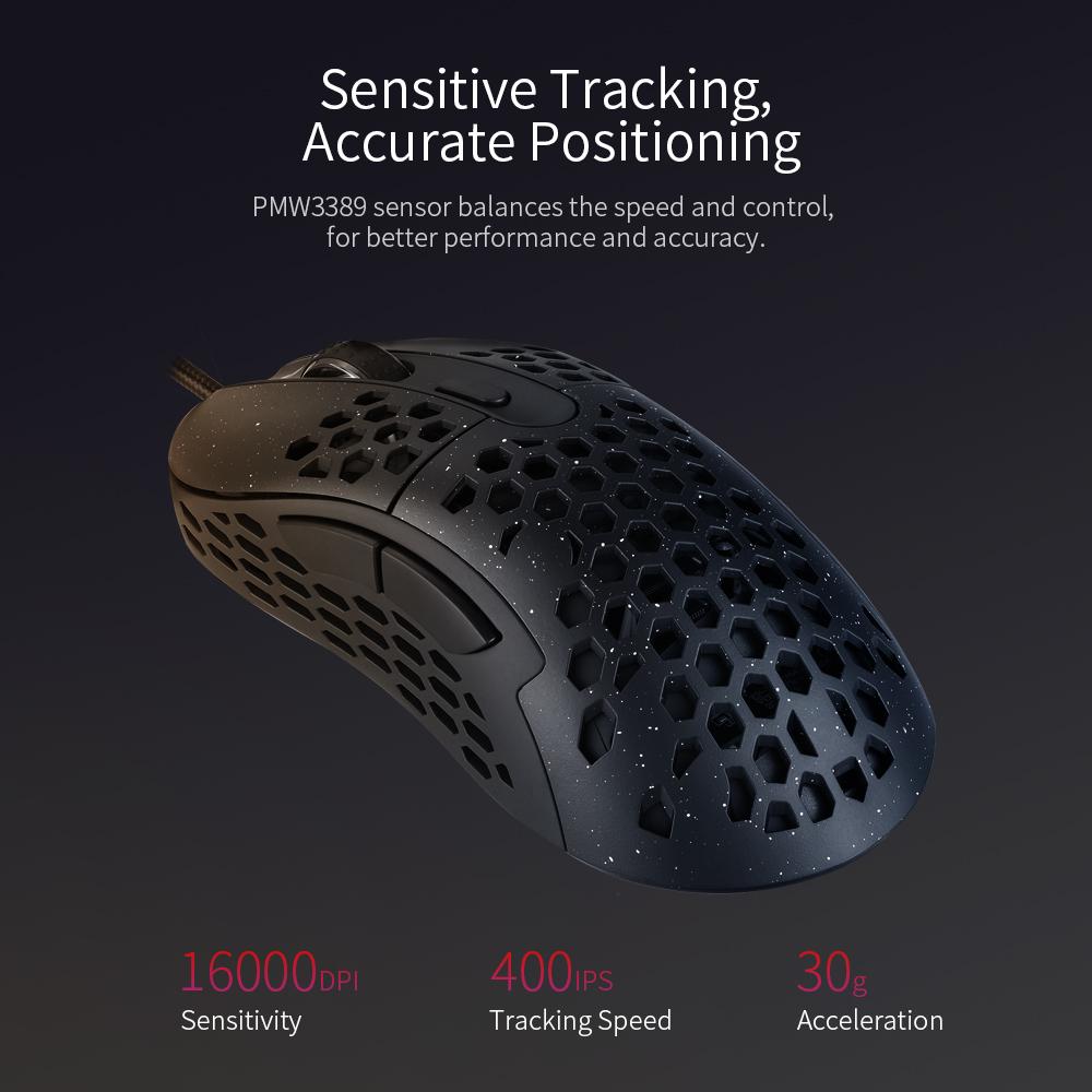 Features: High-precision Optical Sensor This mouse adopt high-precision PixArt PAW3338 optical sensor, with high sensitivity of 16000DPI, 12000fps scan rate, 1000Hz polling rate, able to withstand 40G acceleration and 400IPS movement speed, which can meet