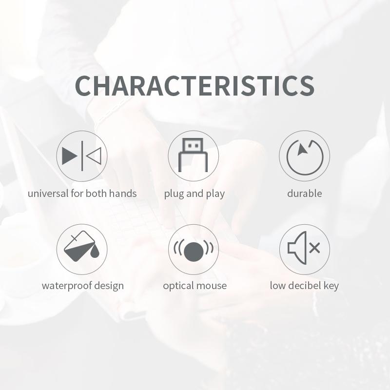 Features: Splash Proof Design Oversized drain holes for you use, never have to worry about keyboard shorts. Mute Button Low decibel keys, greatly reducing the sound of keys, quietly output every character you type. Ergonomic