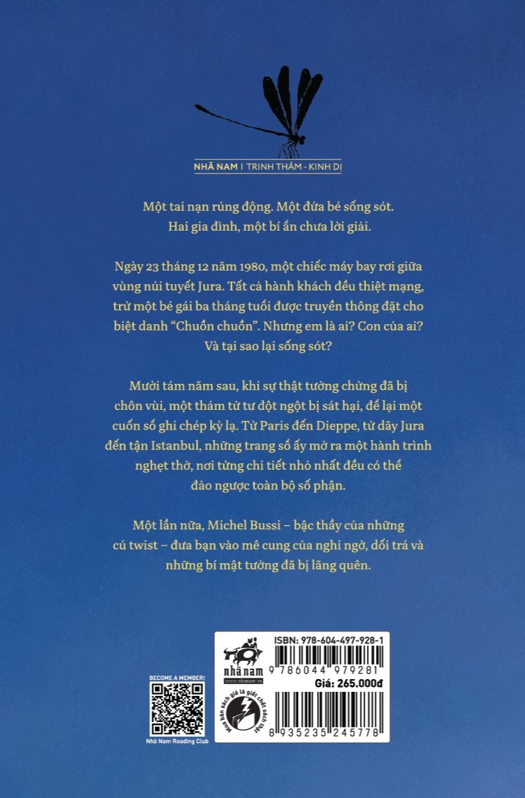 Mua tại TiktokNgày 23 tháng 12 năm 1980, một chiếc máy bay rơi giữa vùng núi tuyết Jura. Tất cả hành khách đều thiệt mạng, trừ một bé gái ba tháng tuổi được truyền thông đặt cho biệt danh “Chuồn chuồn”. Nhưng em là ai? Con của ai? Và tại sao lại sống sót? Mười tám năm sau, khi sự thật tưởng chừng đã bị chôn vùi, một thám tử tư đột ngột bị sát hại, để lại một cuốn sổ ghi chép kỳ lạ. Từ Paris đến Dieppe, từ dãy Jura đến tận Istanbul, những trang sổ ấy mở ra một hành trình nghẹt thở, nơi từng chi tiết nhỏ nhặt đều có thể đảo ngược toàn bộ số phận. Một lần nữa, Michel Bussi – bậc thầy của những cú twist – đưa bạn vào mê cung của nghi ngờ, dối trá và những bí mật tưởng đã bị lãng quên .