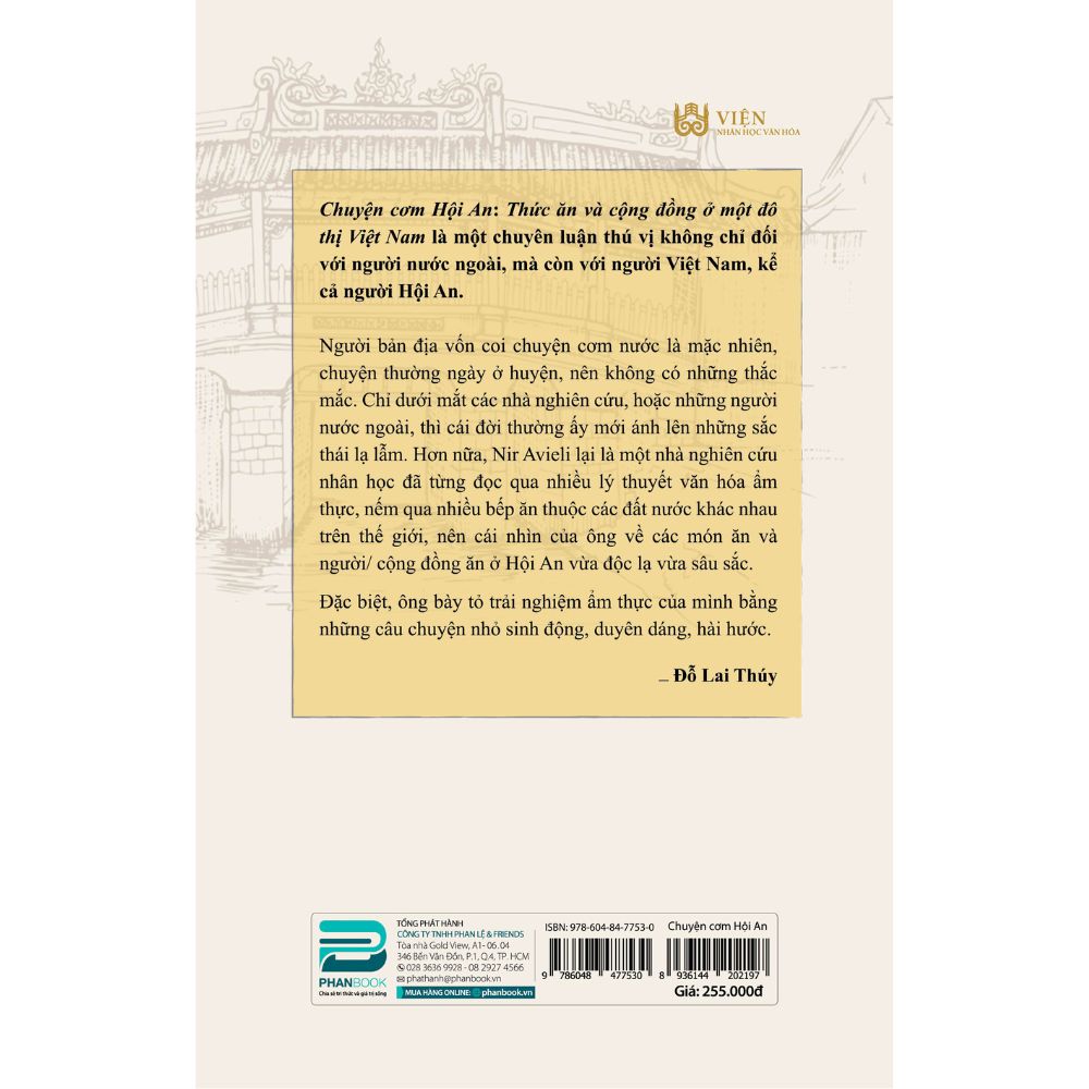 Chuyện Cơm Hội An "Là một công trình dân tộc học ẩm thực về Hội An, một đô thị phồn thịnh với khoảng 30.000 cư dân ở miền Trung Việt Nam, cuốn sách này mô tả các thực hành ăn uống địa phương và phân tích các đặc điểm xã hội và văn hóa của chúng. Do đó, Chuyện cơm Hội An trước hết được dự định là một đóng góp quan trọng cho ngành nhân học Việt Nam, giải quyết tình trạng khan hiếm các nghiên cứu về ẩm thực Việt Nam và đặc biệt là sự bỏ quên lĩnh vực ẩm thực phức hợp của Hội An, một đô thị cổ đã tham gia vào thương mại toàn cầu và trao đổi văn hóa trong nhiều thế kỷ." Dữ liệu dân tộc học được trình bày trong cuốn sách này là kết quả của một dự án đang diễn ra bắt đầu từ năm 1998. Trong khi mười hai tháng nghiên cứu thực địa đầu tiên của tác giả giai đoạn 1999-2000 đã đặt nền móng cho cuốn sách, thì những đợt lưu trú ngắn hơn, lặp đi lặp lại, từ hai đến ba tháng mỗi năm kể từ năm 2001 đã cho phép Nir Avieli theo dõi chặt chẽ các quá trình phát triển và biến đổi mạnh mẽ, vốn đã tạo nên nét đặc trưng cho cuộc sống ở Hội An trong thời kỳ này và hiện vẫn đang tiếp diễn. Thông tin tác giả Nir Avieli Nir Avieli là giảng viên Khoa Xã hội học và Nhân học tại Đại học Ben Gurion ở Israel. Là một nhà nhân học văn hóa, mối quan tâm nghiên cứu chính của ông là âm thực và du lịch.