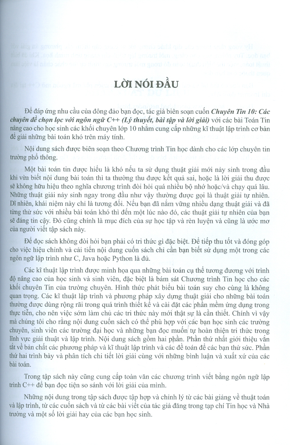 Để đáp ứng nhu cầu của đông đảo bạn đọc, tác giả biên soạn cuốn Chuyên Tin 10: Các chuyên đề chọn lọc với ngôn ngữ C++ (Lý thuyết, bài tập và lời giải) với