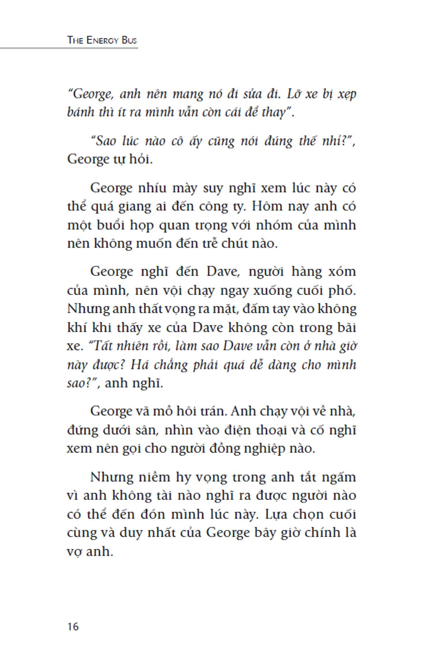 10 quy tắc tiếp năng lượng tích cực cho cuộc sống, công việc và đội ngũ của bạn Mỗi người trong chúng ta đều có những rắc rối riêng. Một số người gặp trục trặc trong hôn nhân, số khác thì phải đối mặt với những vướng mắc trong công việc hoặc vấn đề sức khỏe. Việc xem nó là tốt hay xấu phụ thuộc vào cách nhìn nhận của mỗi người. Và chính cách nhìn nhận này sẽ quyết định cuộc đời bạn là một vở hài kịch hay bi kịch. Nhiều nhà nghiên cứu chỉ ra rằng, với nguồn năng lượng tích cực, con người không chỉ cảm thấy hạnh phúc hơn, làm việc hiệu quả hơn, mà còn có thể nâng cao tuổi thọ. Từ kinh nghiệm của bản thân cũng như những người xung quanh, tác giả Jon Gordon đã tìm ra mười quy tắc giúp mọi người xây dựng nguồn năng lượng tích cực. Các quy tắc được ông truyền tải một cách dễ hiểu thông qua câu chuyện của George trong cuốn sách “Chuyến xe buýt đổi đời” (tái bản từ cuốn Chuyến xe năng lượng). Trong sách, bạn sẽ theo chân George trải qua hàng loạt rắc rối, từ việc chiếc xe xẹp lốp, đứa con quấy khóc, cho đến những trở ngại lớn hơn trong sự nghiệp và hôn nhân. Những chuyện mà George trải qua cũng chính là những khó khăn mà chúng ta thường phải đối mặt trong cuộc sống. Ban đầu, anh đối diện với nó bằng thái độ cọc cằn, thù hằn và chán nản. Chính thái độ này làm cho cuộc sống của anh ngày càng trở nên khó khăn. Tuy nhiên, nhờ có Chuyến xe buýt đổi đời của Joy mà George đã nhận ra sai lầm, đồng thời thay đổi từng chút để lèo lái chiếc xe cuộc đời của mình theo hướng tích cực. Thực tế mỗi người chúng ta đều có hai nguồn năng lượng. Một nguồn năng lượng tích cực và một nguồn năng lượng tiêu cực. Năng lượng tích cực giống như một loại nhiên liệu có hàm lượng oc-tan cao, có thể giúp ta đẩy nhanh tốc độ cho cuộc hành trình của mình. Trong khi đó, nguồn năng lượng tiêu cực giống như một loại dầu cặn tồn đọng lâu ngày có thể làm nghẹt nguồn máy của chúng ta. Nguồn năng lượng tích cực không chỉ đến từ sự khích lệ của người khác mà quan trọng hơn, nó bắt nguồn từ chính bản thân chúng ta, từ việc sống có mục đích, lạc quan và nhiệt huyết. Đây là nguồn năng lượng không thể thiếu trong cuộc sống mỗi người, bất kể bạn là doanh nhân, quản lý cấp cao hay chỉ là một người làm công ăn lương. Nếu bạn còn đang loay hoay với những rắc rối của mình, “Chuyến xe buýt đổi đời” của tác giả Jon Gordon sẽ mang đến cho bạn một lăng kính khác để khám phá nguồn năng lượng tích cực của bản thân và tập thể, từ đó tạo ra những thay đổi nhỏ nhưng đáng giá trong cuộc sống. Suy cho cùng, cuộc sống vốn đơn giản nhưng chúng ta lại phức tạp hóa nó bằng những rắc rối. Ta không nên để mọi thứ suy sụp rồi mới bắt đầu suy nghĩ về cuộc đời và ước mơ của mình. Mỗi cuộc khủng hoảng đều tiềm ẩn một cơ hội để chúng ta thấu hiểu và thay đổi bản thân theo hướng tích cực hơn.