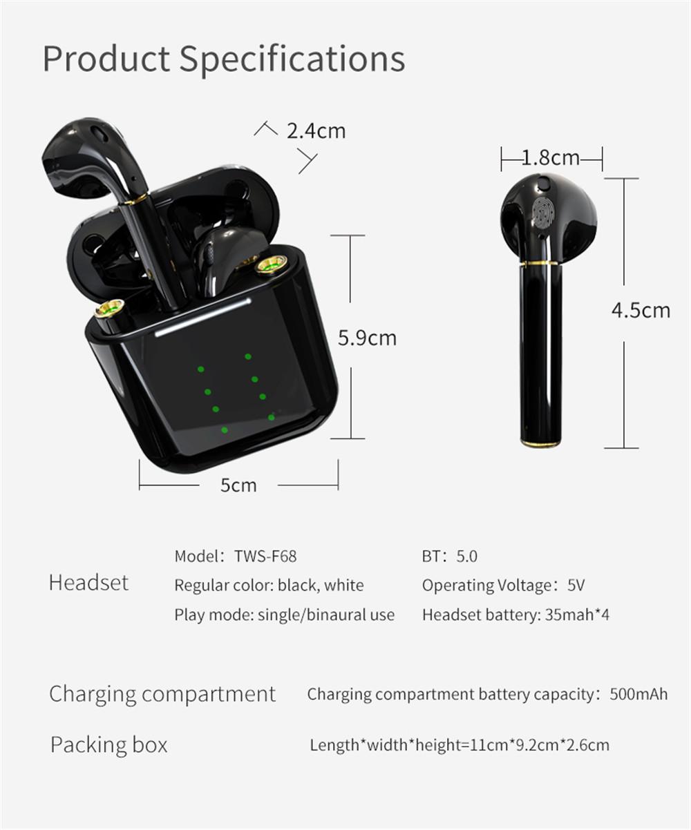 - Bluetooth 5.0, tiêu thụ điện năng thấp Lưu ý: Khi mua tai nghe bluetooth tws quý khách vui lòng đọc hướng dẫn sau: Do vận chuyển lâu ngày nên nguồn điện của tai nghe tws sẽ cạn kiệt, sau khi nhận gói hàng quý khách sẽ không sử dụng được tai nghe, có thể đóng lại. điều đầu tiên cần làm là sạc hộp tai nghe trong 30 phút. Rất quan trọng. Cảm ơn! Bảng kê hàng hóa: 1 Tai nghe Bluetooth (l) 1 Tai nghe Bluetooth (r) 1 hộp sạc 1 Cáp dữ liệu 1 * Hướng dẫn sử dụng