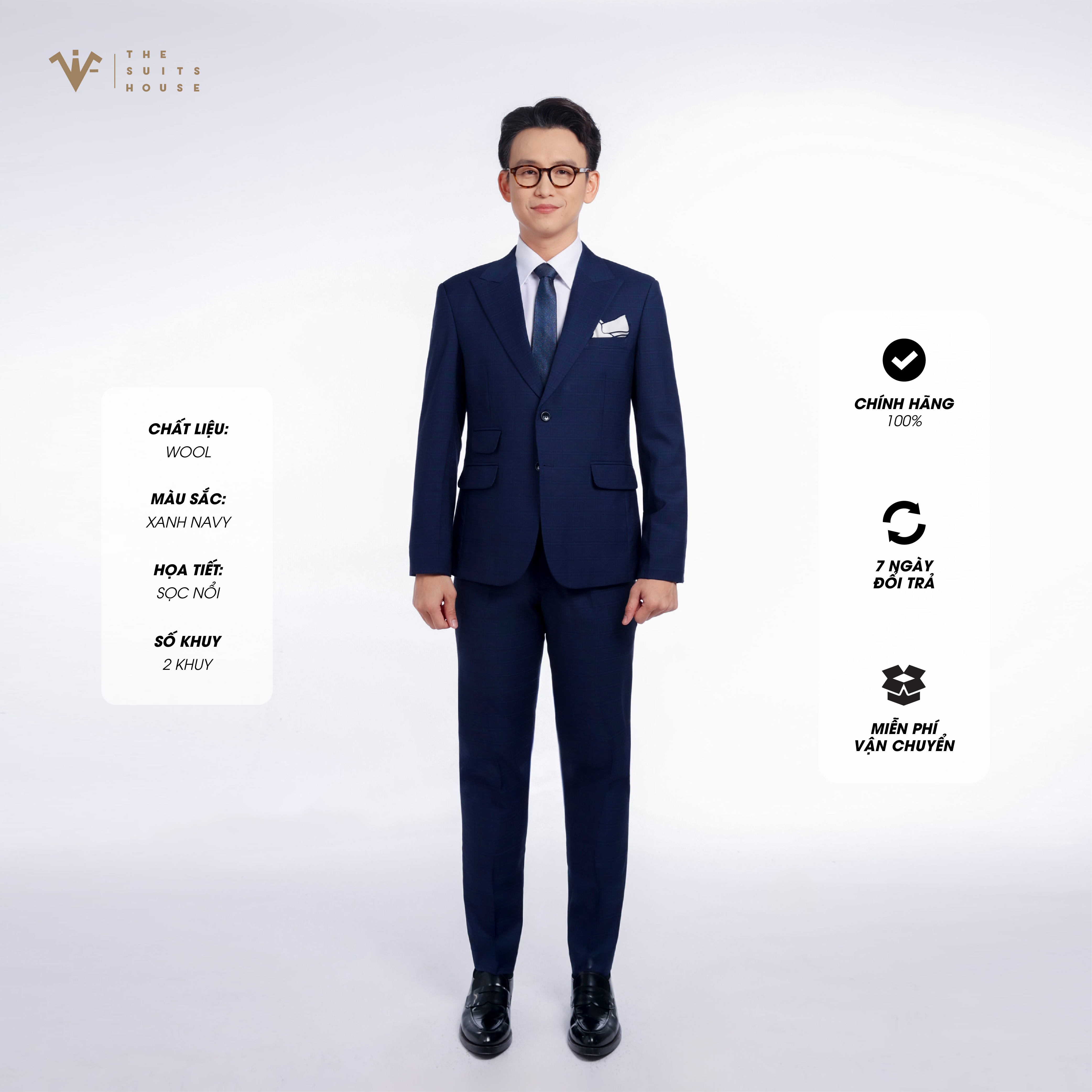 THÔNG TIN SẢN PHẨM - Tên sản phẩm: Bộ suit XANH NAVY KẺ ẨN, 6 KHUY 3 TÚI - Thương hiệu: THE SUITS HOUSE - Xuất xứ: Việt Nam - Chất liệu: Vải sợi len