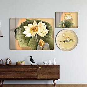 ✨(CÓ ẢNH THẬT) Tranh đồng hồ hoa sen 4 bộ 3 tấm trang trí decor phòng bo viền kèm đinh treo