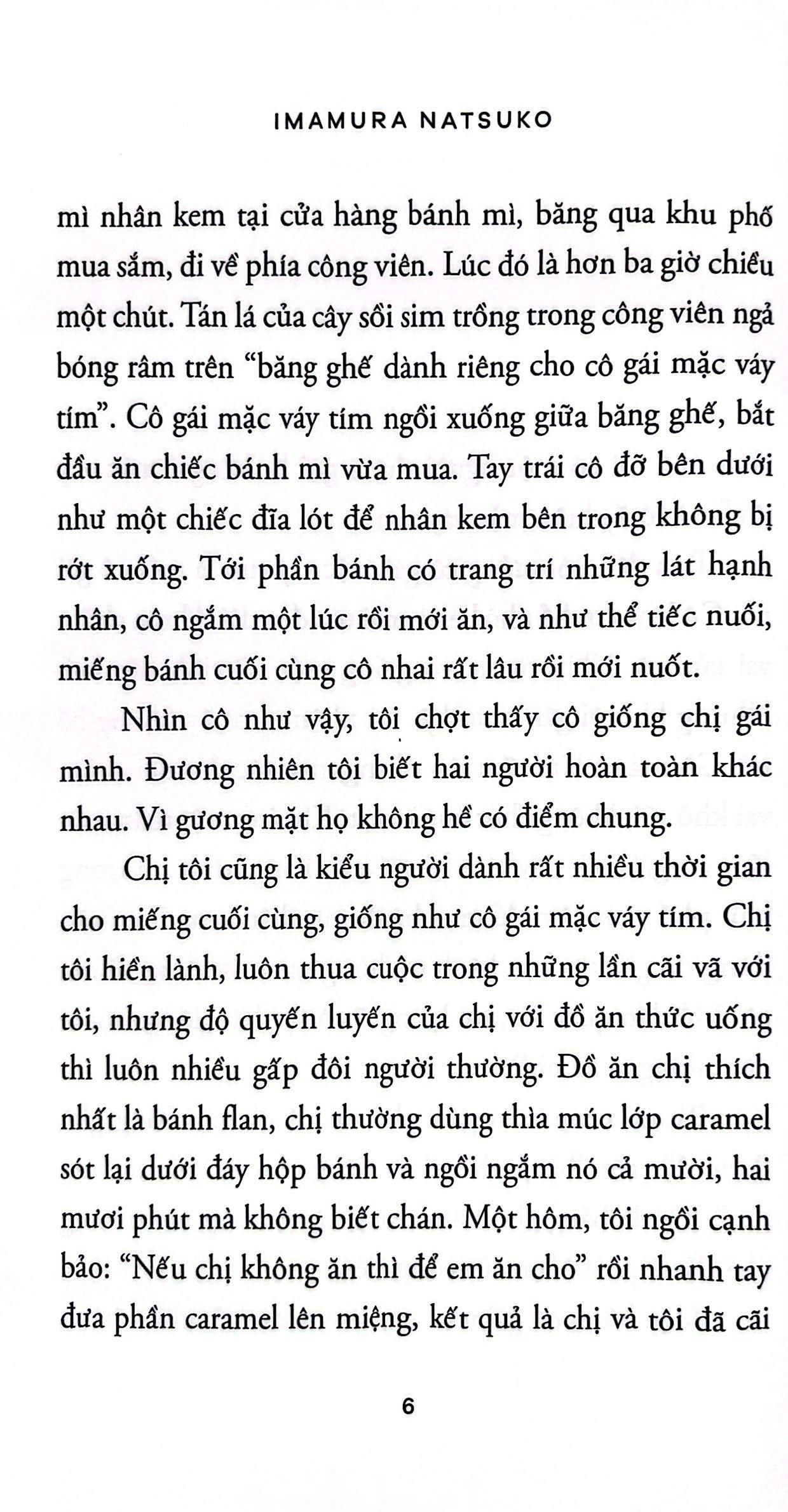 Khắc họa một người dẫn chuyện có phần ngờ nghệch và kỳ dị là một việc hết sức khó khăn nhưng nhờ sự diện hiện của “cô gái mặc váy tím” mà những điều lẩn khuất trong bóng tối về nhân vật “tôi” lại càng trở nên có chiều sâu. Khi đọc đến đoạn cuối, khi “tôi” đang định ăn bánh mì kem thì bị một đứa bé vỗ vào vai, nỗi buồn như muốn phát điên choán lấy lồng ngực tôi. Tác giả Imamura quả nhiên rất có tài năng trong việc khắc họa sống động những con người đi lệch quỹ đạo thông thường của con người. – Ogawa Yoko