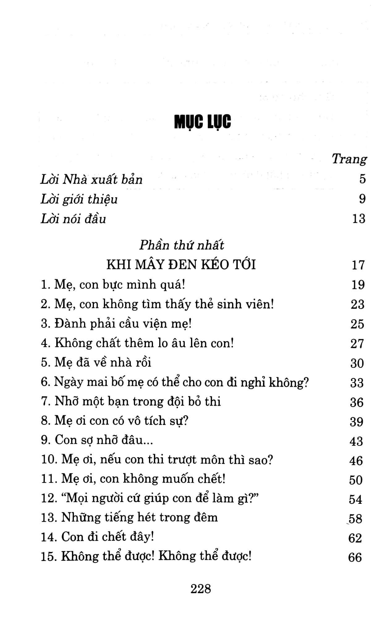 Đây là một cuốn cẩm nang dành cho bố mẹ đang cùng con chiến đấu chống lại căn bệnh trầm cảm mà đôi khi tưởng chừng như bất lực. Cuốn sách cũng là những câu chuyện nhỏ khiến những người bệnh đang một m.ình đơn độc, bất giác nhận ra là m.ình đã bỏ lỡ liều thuốc hiệu quả nhất trong hành trình dai dẳng mà bệnh tật đeo bám này: liều thuốc tinh thần, liều thuốc của sự sẻ chia và thấu hiểu; liều thuốc của những hiểu biết đúng, những nhận thức đủ quan trọng về căn bệnh, một cách giản đơn mà không tài liệu khoa học nào có thể thay thế được.