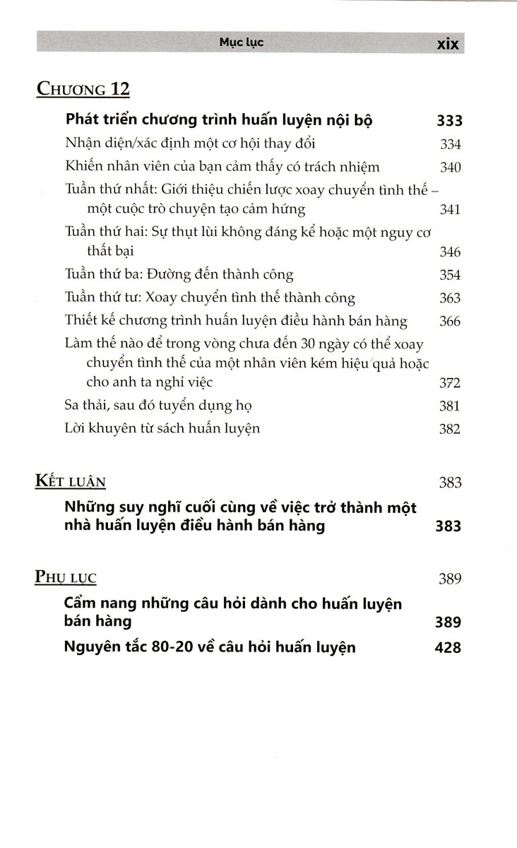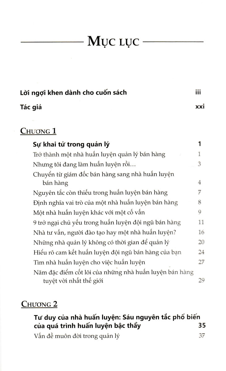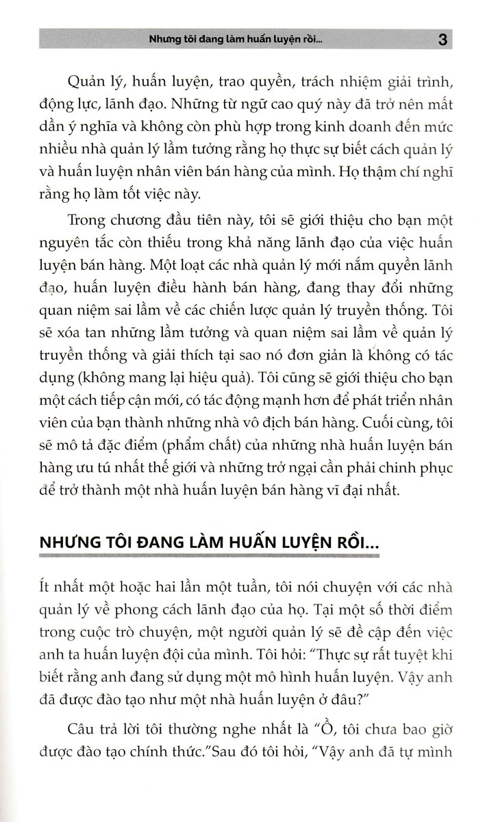 Coaching Salespeople Into Sales Champions - Huấn Luyện Nhân Viên Bán Hàng Trở Thành Nhà Vô Địch Bán Hàng     Quyển sách Huấn Luyện Nhân Viên Bán Hàng Trở Thành Nhà Vô Địch Bán Hàng là một tác phẩm được trao 5 giải thưởng quốc tế dành cho Sách hay nhất và là cuốn sách quản lý bán hàng bán chạy nhất trên trong năm năm liên tiếp. Bằng việc sử dụng phương pháp huấn luyện của Keith Rosen - phương pháp được sử dụng bởi những tổ chức hàng đầu thế giới và với khung huấn luyện L.E.A.D.S - các giám đốc điều hành, các quản lý nhân sự - sẽ giúp đội ngũ quản lý và bán hàng của m.ình đạt kết quả hoạt động tốt hơn - nhanh hơn. Cuốn sách này bao gồm các nghiên cứu điển hình, chiến lược xoay chuyển tình thế trong 30 ngày dành cho những người làm việc kém hiệu quả, một thư viện gồm các biểu mẫu và kịch bản huấn luyện, cũng như hàng trăm câu hỏi huấn luyện mạnh mẽ. Bạn có thể sử dụng ngay lập tức để huấn luyện bất kỳ ai trong mọi tình huống. Huấn Luyện Nhân Viên Bán Hàng Trở Thành Nhà Vô Địch Bán Hàng là cẩm nang của bạn để tạo ra một nền văn hóa huấn luyện tiến bộ và xây dựng đội ngũ những nhân viên hàng đầu .
