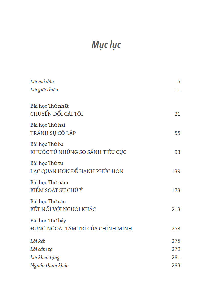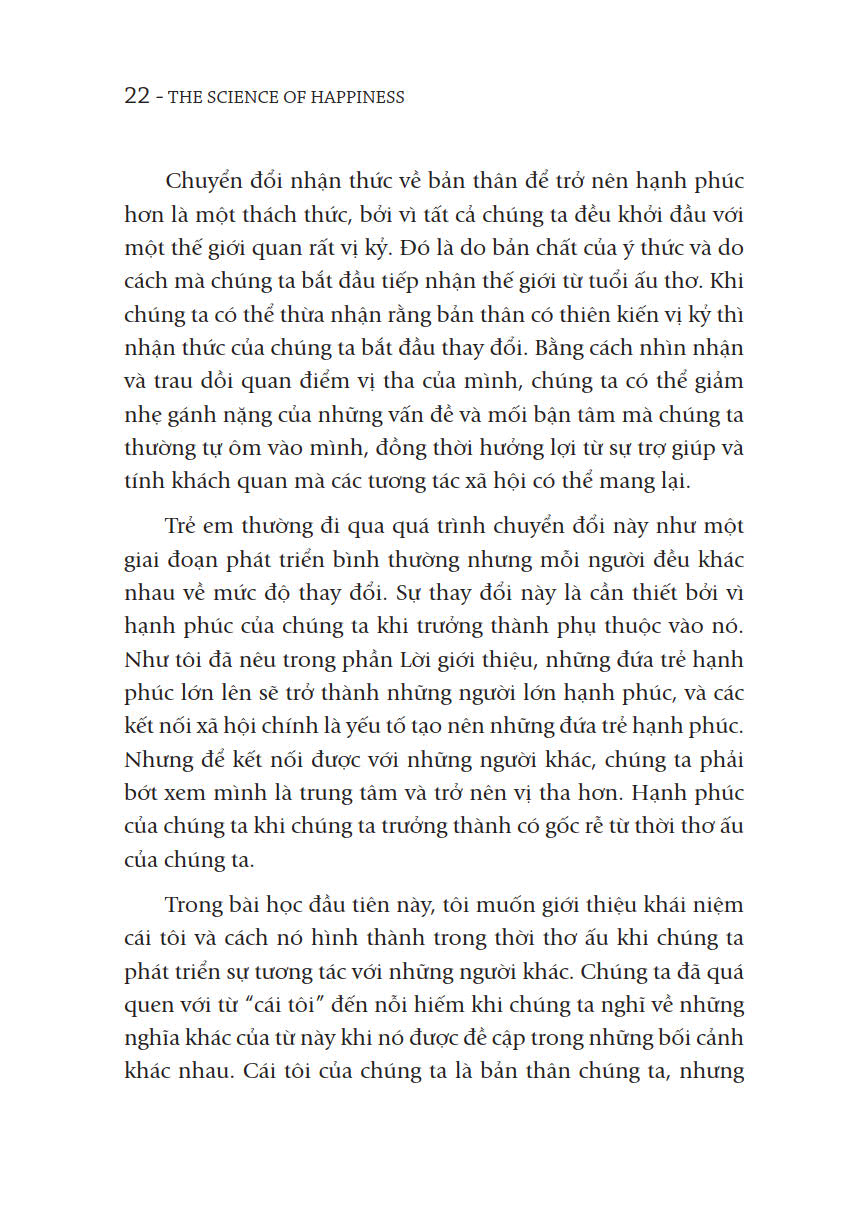 Vấn đề ngăn trở chúng ta đạt được hạnh phúc là cách tâm trí con người được tiến hóa để thích nghi với thế giới từ một góc nhìn vị kỷ và tập trung vào những mối đe dọa sống còn trong quá khứ. Khởi đầu là những đứa trẻ duy kỷ phụ thuộc vào người khác về mặt xã hội, chúng ta lớn lên thành những người lớn bớt vị kỷ hơn nhưng không cảm thấy hạnh phúc bởi vì bộ não của chúng ta được thiết kế để tập trung vào những thông tin và sự so sánh sai lệch khi đánh giá cuộc đời mình. Điều chúng ta cần làm là đứng ngoài tâm trí của chính mình bằng cách kết nối với những người khác và thế giới xung quanh mình thông qua những hoạt động khiến chúng ta hạnh phúc hơn .