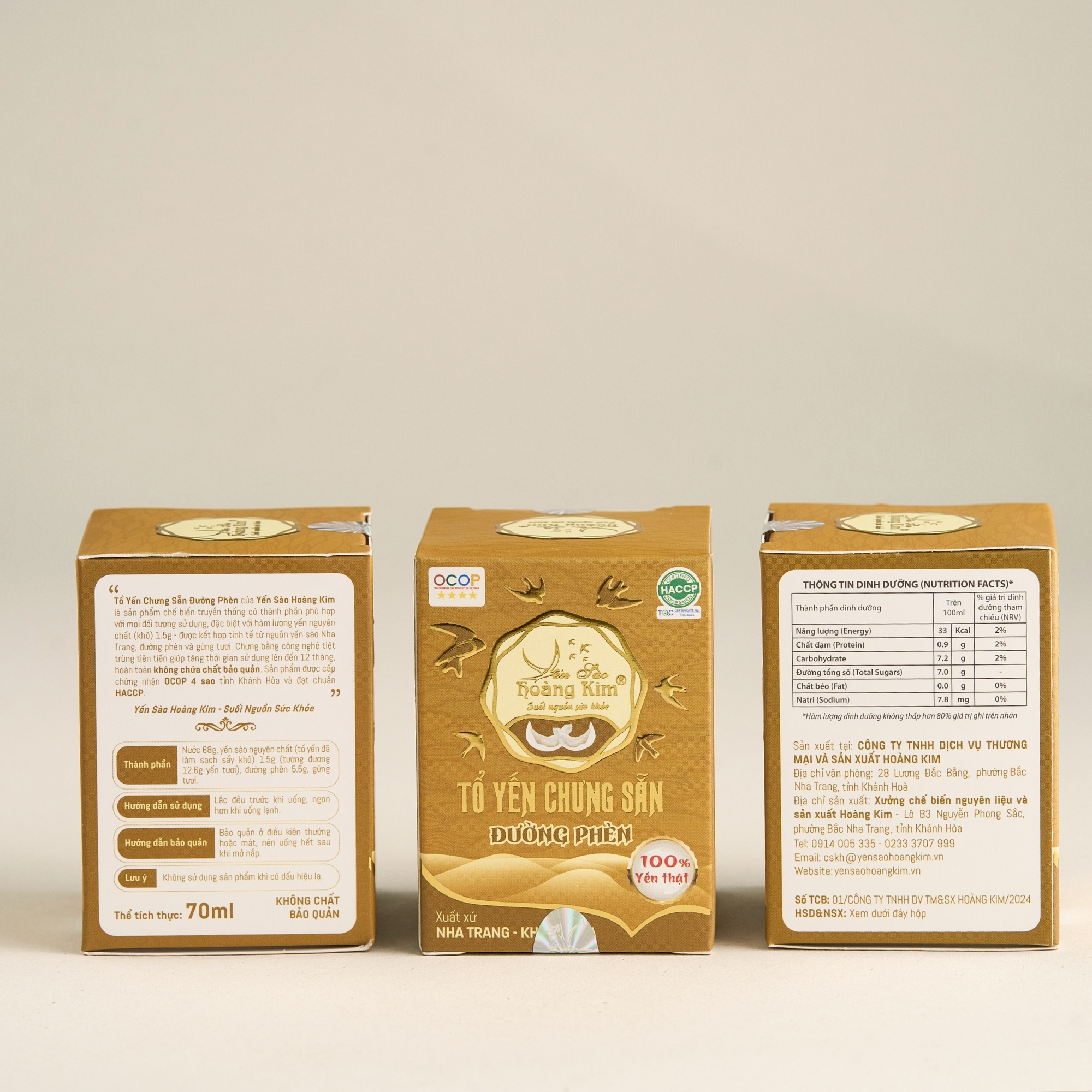 YẾN SÀO HOÀNG KIM - DINH DƯỠNG VÀNG TỪ THIÊN NHIÊN   Cuộc sống bận rộn khiến bạn không có thời gian chăm sóc sức khỏe? Chỉ cần 1 hũ Yến Chưng Sẵn Đường Phèn Hoàng Kim mỗi ngày, bạn đã nạp đủ năng lượng và dưỡng chất để cơ thể luôn khỏe mạnh!   VÌ SAO KHÁCH HÀNG TIN CHỌN YẾN SÀO HOÀNG KIM?     CHUẨN VÀNG OCOP 4 SAO KHÁNH HÒA: Chất lượng được UBND tỉnh Khánh Hòa kiểm định và chứng nhận năm 2024, an tâm tuyệt đối.  100% TỰ NHIÊN, KHÔNG CHẤT BẢO QUẢN: Chỉ có yến sào thật, đường phèn ngọt thanh và gừng tươi ấm nóng. Hoàn toàn không hương liệu, không chất bảo quản, an toàn cho cả gia đình.  CÔNG NGHỆ CHƯNG HẤP TIỆT TRÙNG (HACCP): Quy trình sản xuất khép kín chuẩn quốc tế, giúp giữ trọn vẹn dinh dưỡng mà không cần chất bảo quản.  BỒI BỔ VƯỢT TRỘI: Cung cấp năng lượng, hỗ trợ tăng cường sức đề kháng, phục hồi sức khỏe nhanh chóng. THÔNG TIN CHI TIẾT: