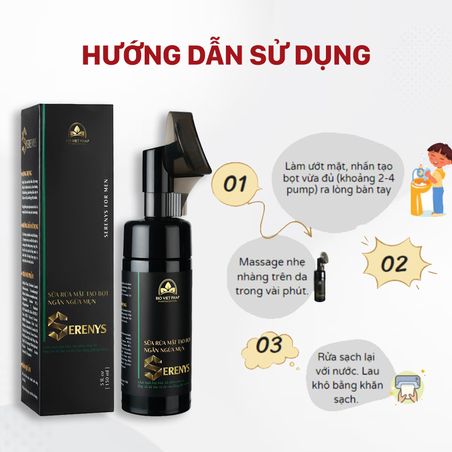 Duy trì độ ẩm tự nhiên, mang lại làn da sáng sạch, căng bóng, mịn màng hơn. Hãy cùng Serenys nâng niu làn da của bạn và tự tin tỏa sáng. Chúc bạn một ngày vui vẻ! HƯỚNG DẪN SỬ DỤNG SỮA RỬA MẶT NAM SERENYS Sữa rửa mặt tạo bọt ngăn ngừa mụn Serenys là sản phẩm vệ sinh hàng ngày chuyên biệt dành cho nam giới. Gồm 3 bước đơn giản sau: