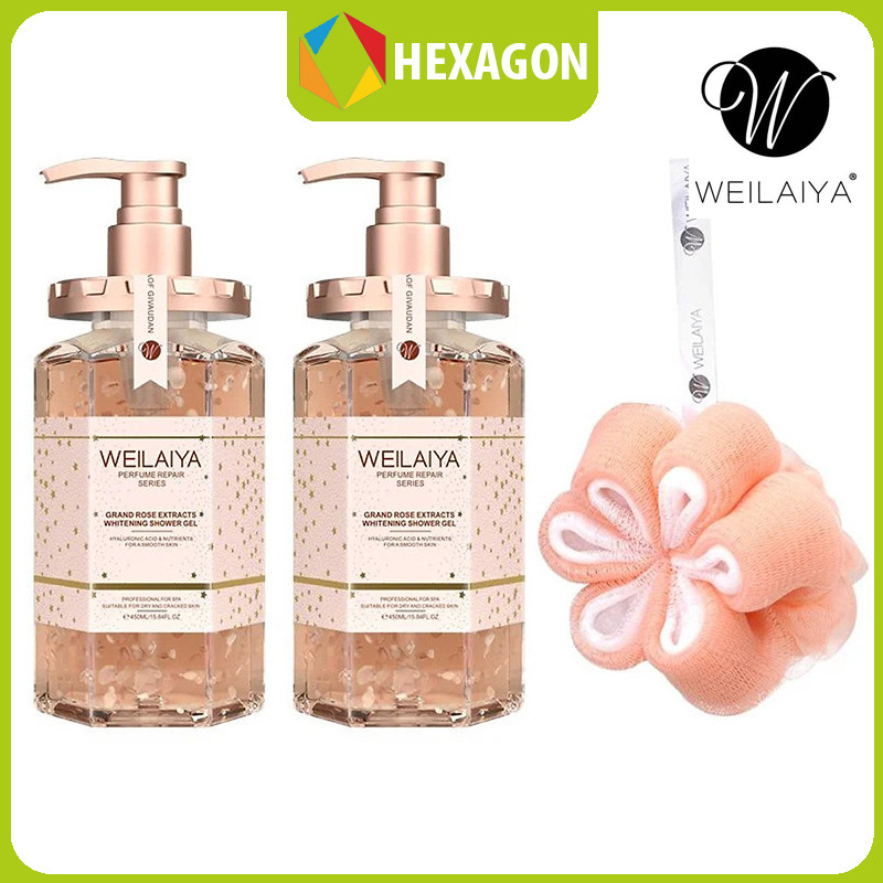 ✨Combo 2 chai Sữa tắm trắng da cánh hoa hồng Damask Weilaiya Grand Rose Extracts Whitening Shower Gel 450ml tặng 1 Bông tắm Weilaiya