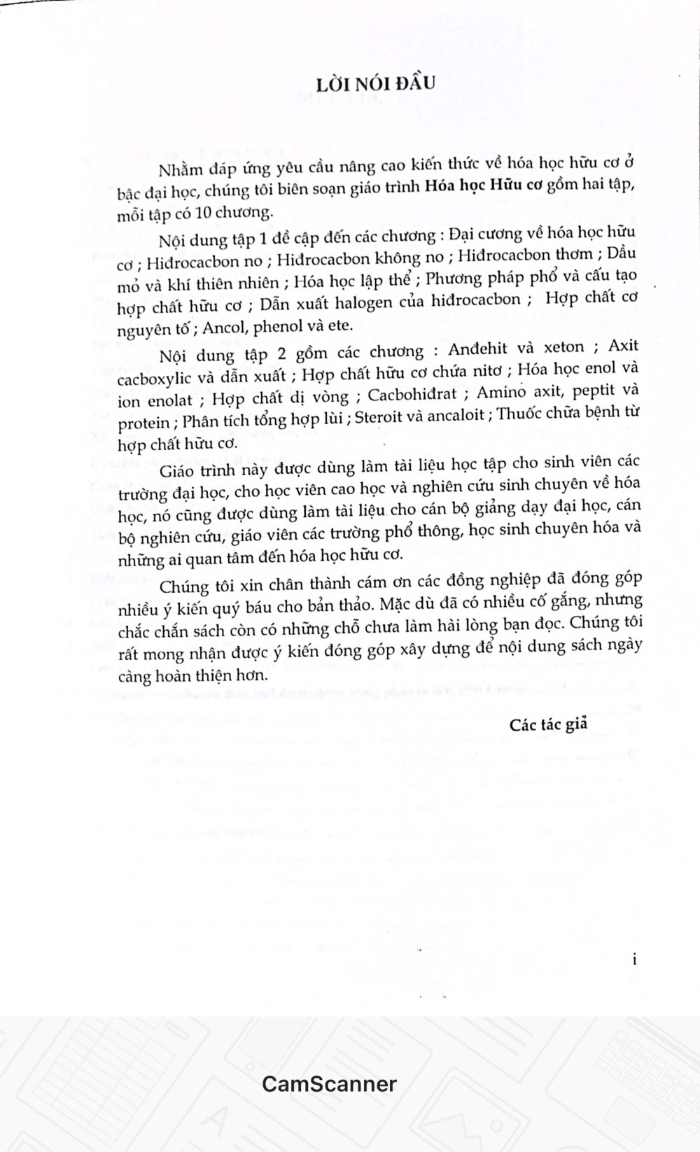 Nhằm đáp ứng yêu cầu nâng cao kiến thức về hóa học hữu cơ ở bậc đại học, chúng tôi biên soạn giáo trình Hóa học Hữu cơ gồm hai tập, mỗi tập có 10 chương.    Nội dung tập 1 đề cập đến các chương : Đại cương về hóa học hữu cơ ; Hidrocacbon no ; Hidrocacbon không no ; Hiđrocacbon thơm ; Dầu mỏ và khí thiên nhiên ; Hóa học lập thể ; Phương pháp phổ và cấu tạo hợp chất hữu cơ ; Dẫn xuất halogen của hiđrocacbon ; Hợp chất cơ nguyên tố ; Ancol, phenol và ete.            Nội dung tập 2 gồm các chương : Anđehit và xeton ; Axit cacboxylic và dẫn xuất ; Hợp chất hữu cơ chứa nitơ ; Hóa học enol và ion enolat ; Hợp chất dị vòng ; Cacbohiđrat ; Amino axit, peptit và protein ; Phân tích tổng hợp lùi ; Steroit và ancaloit ; Thuốc chữa bệnh từ hợp chất hữu cơ.       Giáo trình này được dùng làm tài liệu học tập cho sinh viên các trường đại học, cho học viên cao học và nghiên cứu sinh chuyên về hóa học, nó cũng được dùng làm tài liệu cho cán bộ giảng dạy đại học, cán bộ nghiên cứu, giáo viên các trường phổ thông, học sinh chuyên hóa và những ai quan tâm đến hóa học hữu cơ.       Chúng tôi xin chân thành cám ơn các đồng nghiệp đã đóng góp nhiều ý kiến quý báu cho bản thảo. Mặc dù đã có nhiều cố gắng, nhưng chắc chắn sách còn có những chỗ chưa làm hài lòng bạn đọc. Chúng tôi rất mong nhận được ý kiến đóng góp xây dựng để nội dung sách ngày càng hoàn thiện hơn.