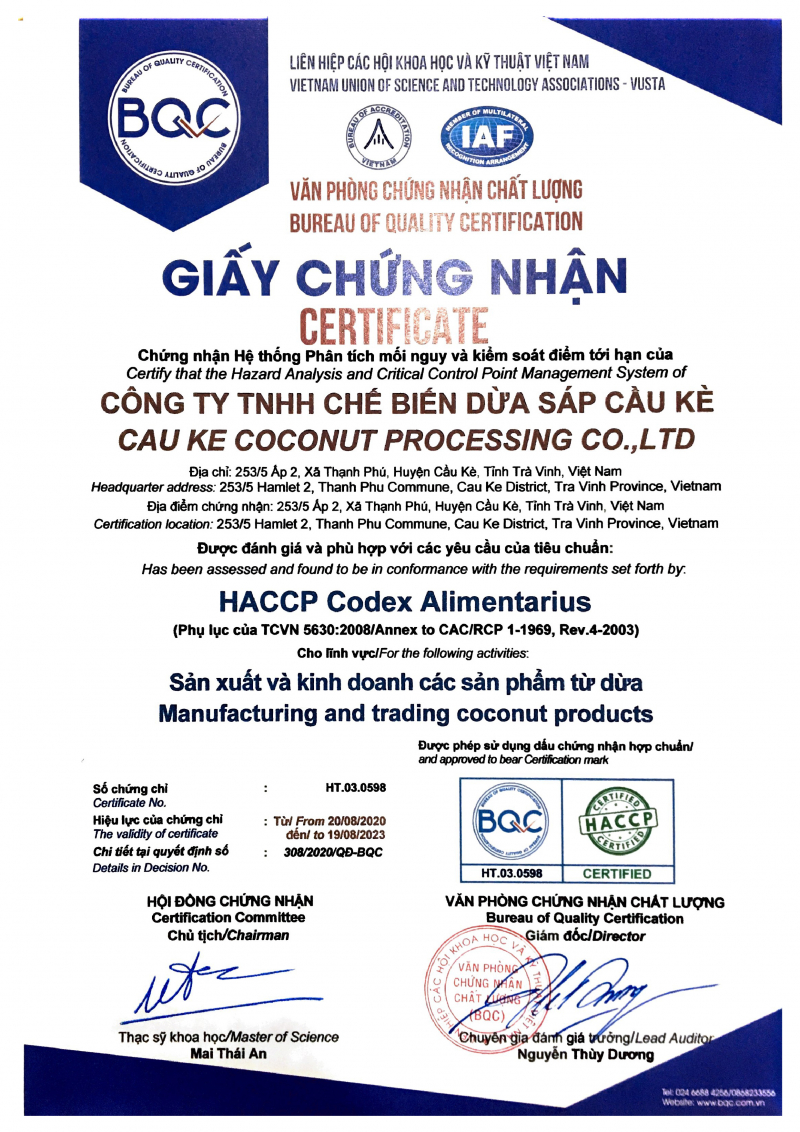 - Các thành tựu nổi bật đã được thực tế khẳng định: Quy trình sản xuất đạt chứng nhận ISO 22000:2018; ISO 9001:2015, HACCP, FDA và gần đây nhất là HALAL. Vicosap đang có mặt ở các Chuỗi Siêu thị lớn, Hệ thống Sân bay Quốc tế, các Cửa hàng Đặc sản, Điểm du lịch…. Sản phẩm dừa sáp Vicosap đã xuất khẩu chính ngạch thành công các thị trường khó tính như Nhật Bản, Anh, Mỹ, Hongkong và Đài Loan … 4. CHÍNH SÁCH BÁN HÀNG: