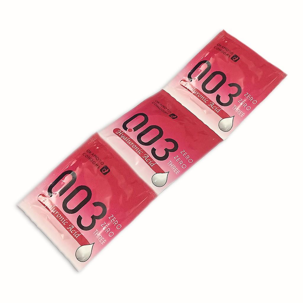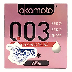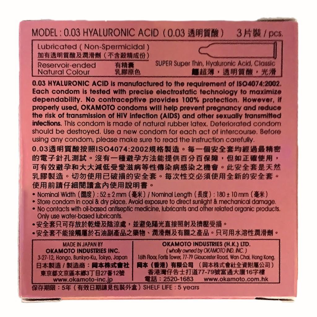 - MÔ TẢ Bao Cao Su Okamoto 0.03 Hyaluronic Acid Siêu Mỏng, Dưỡng Ẩm có thiết kế siêu mỏng chỉ 0.03mm mnag lại cảm giác chân thực như không dùng, cùng khả năng truyền nhiệt nhanh để đôi bạn cảm nhận trọn vẹn nhất hơi ấm cơ thể, từng đường gân, làn da của nhau Phòng tránh thai Ngăn ngừa HIV và các bệnh lây qua đường tình dục