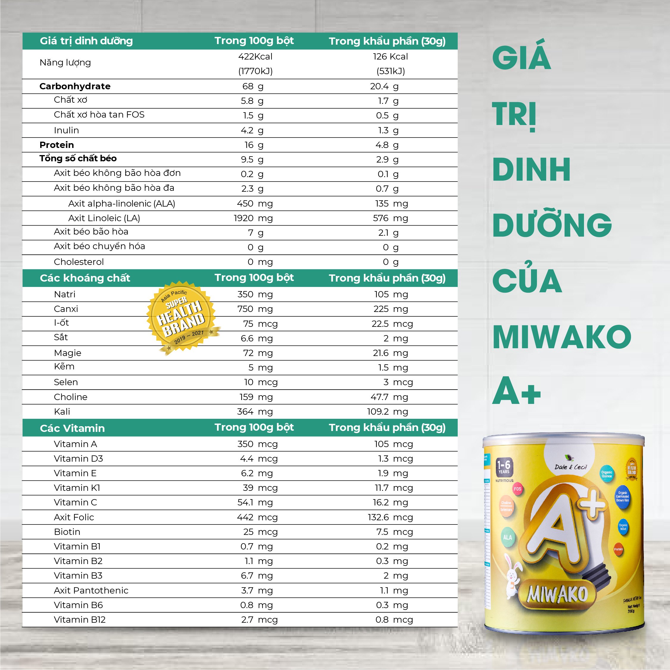 Combo 4 Hộp 400g Sữa Công Thức Hữu Cơ Miwako A+ Vị Vani, Sữa Hạt Cho Bé Phát Triển Trí Não Chiều Cao THÔNG TIN SẢN PHẨM SỮA HẠT MIWAKO A+, SỮA HỮU CƠ CHO