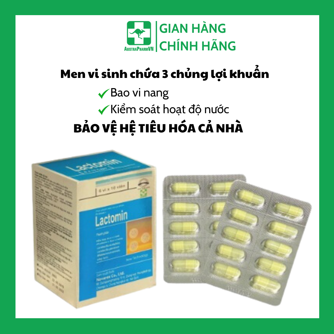 - Dùng cho người bị rối loạn tiêu hóa do loạn khuẩn đường ruột, dùng kháng sinh dài ngày, tiêu chảy, táo bón, đi ngoài phân sống, đi nhiều lần. VÌ SAO NÊN CHỌN SỬ DỤNG MEN VI SINH LACTOMIN? Men vi sinh là những vi sinh vật có lợi cho sức khỏe đường ruột, nhưng rất nhạy cảm và dễ bị huỷ hoại bởi môi trường acid dạ dày. Nên bổ sung men vi sinh có hàm lượng cao là chưa đủ mà làm sao bảo vệ men “còn sống” đến ruột tối thiểu 10^8 CFU (100 triệu đơn vị lợi khuẩn) - hàm lượng đủ để phát huy tác dụng là điều kiện then chốt quyết định chất lượng và hiệu quả sử dụng men vi sinh. Men vi sinh Lactomin Plus chứa 3 chủng men vi sinh có lợi, được sản xuất bằng công nghệ bao vi nang (đóng gói con men trong lớp bao protein) - lớp bao này như chiếc áo giáp bảo vệ con men an toàn vượt qua môi trường acid dạ dày, kết hợp công nghệ đóng gói trong khí nitơ và kiểm soát hoạt độ nước, giúp kéo dài tuổi thọ men vi sinh. Đảm bảo đạt hàm lượng tối thiểu 10^8 CFU/gói còn sống đến khi sử dụng và phát huy hiệu quả. THÀNH PHẦN: Mỗi viên nang 400mg có chứa: Hỗn hợp vi khuẩn sinh acid lactic dạng bao vi nang gồm: Lactobacillus acidophilus, Lactobacillus plantarum, Bifidobacterium animalis subsp. lactis 100.000.000 CFU/g (10^8 CFU/g). Thành phần khác: Vegetable cream powder, Microcrystalline cellulose, Fructo oligosaccharide (FOS), Magnesium stearate vừa đủ 1 viên. CÁCH DÙNG VÀ LIỀU DÙNG: