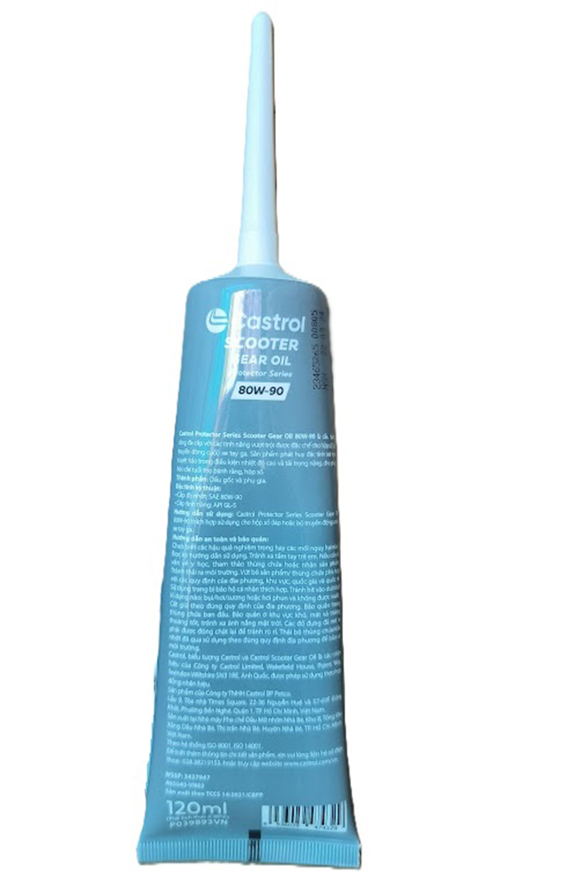 - Công suất tối đa phù hợp với các động cơ có trang bị bộ xúc tác khí thải. Khả năng tăng tốc phụ thuộc vào cách lái xe và độ nhớt của sản phẩm. Quy cách đóng chai: Chai 800ML (0,8 lít). Castrol Scooter Gear oil là dầu hộp số cho xe tay ga (hay còn gọi là dầu Láp) Tiêu chuẩn kỹ thuật: SAE 80W-90, API GL-5 Thể tích thực: 120ml (0,12 lít). Nhiều người sử dụng xe ga thường chỉ nhớ thay dầu động cơ mà quên thay dầu hộp số định kỳ, nếu tình trạng này kéo dài sẽ dẫn đến dầu hộp số cũ trong xe bị hỏng và mất khả năng bôi trơn dẫn đến hỏng bộ bánh răng hộp số, do vậy chúng ta cũng cần phải thay định kỳ dầu hộp số cho xe tay ga, thông thường thì 2 lần thay dầu động cơ thì nên thay dầu hộp số 1 lần.